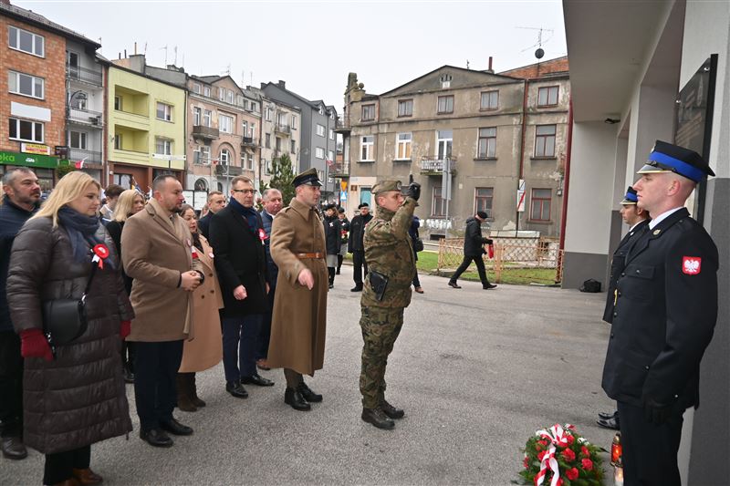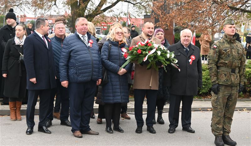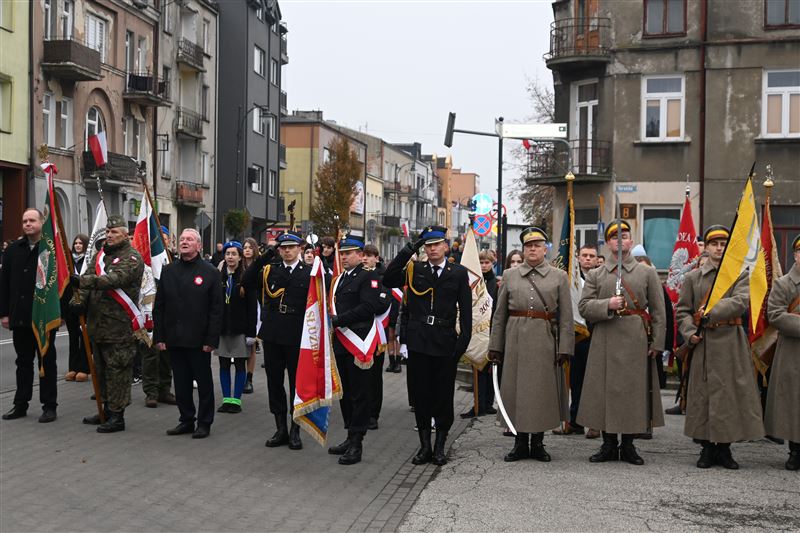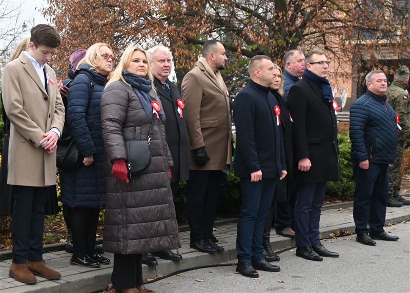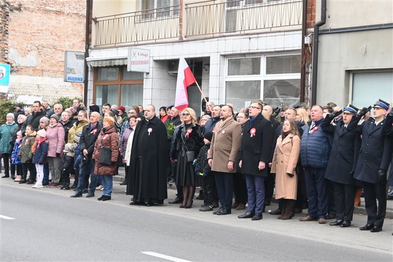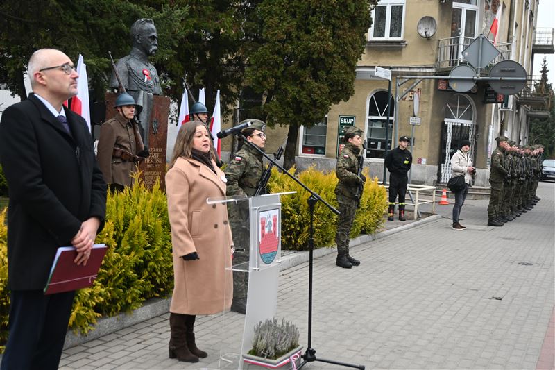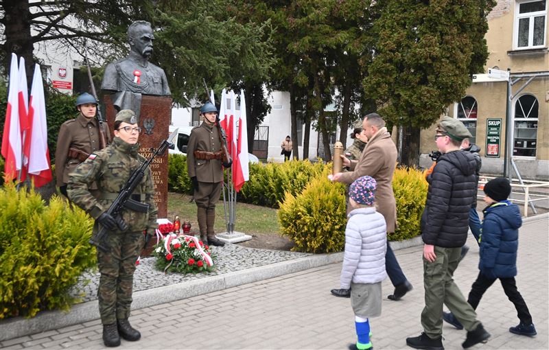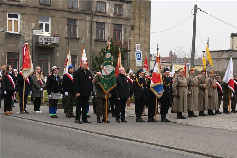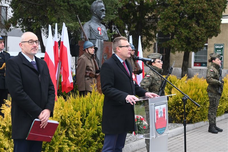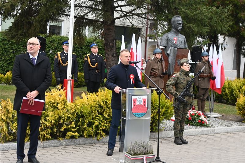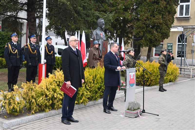 Burmistrz miasta Daniel Janiak odebrał od harcerzy symboliczny Ogień Niepodległości, który ustawiono przed popiersiem Piłsudskiego. Zebrani mieszkańcy i samorządowcy odśpiewali hymn Polski, wciągnięto flagę na maszt. Były przemówienia okolicznościowe gości, przypominające o patriotyzmie, wolności i obronie polskiej tożsamości i wiary. Odczytano apel pamięci, była salwa honorowa.