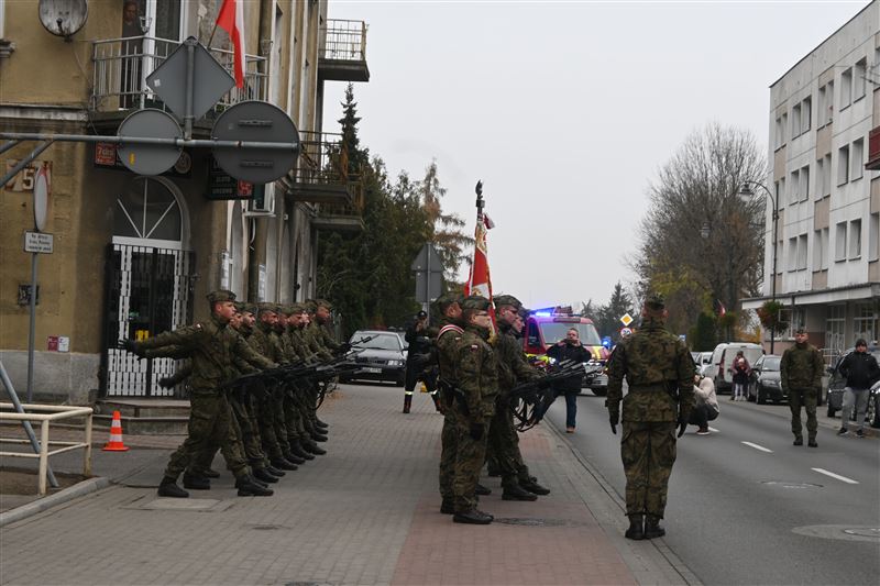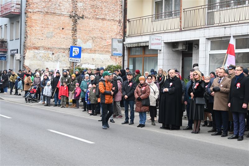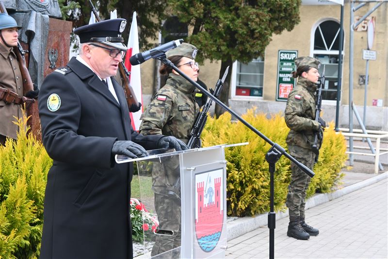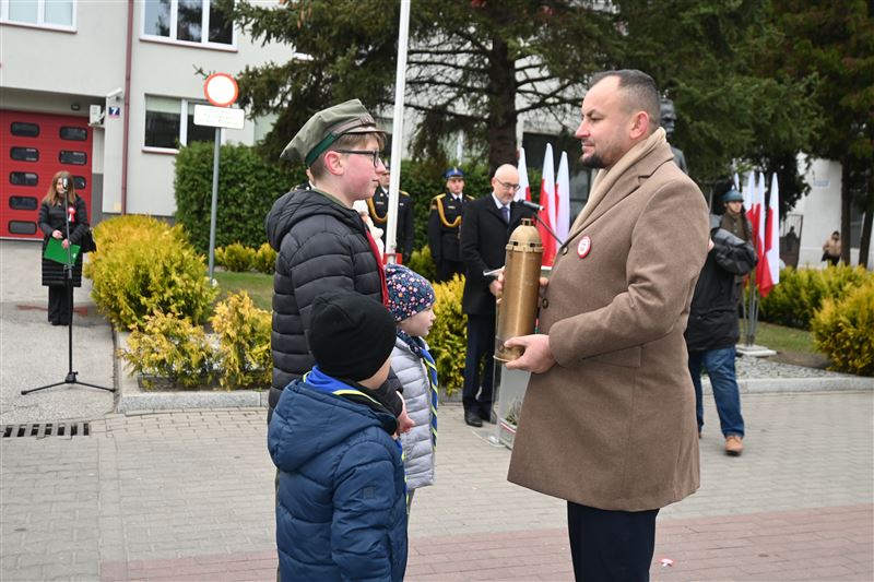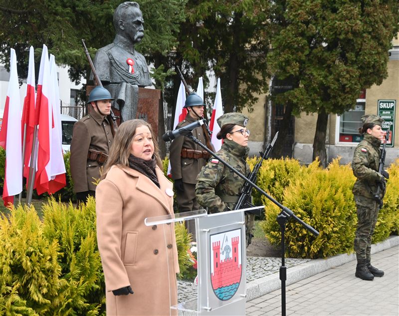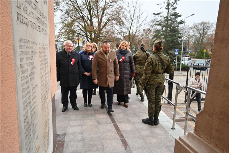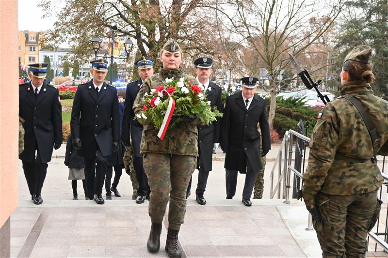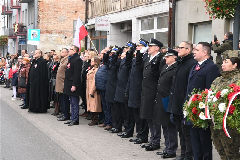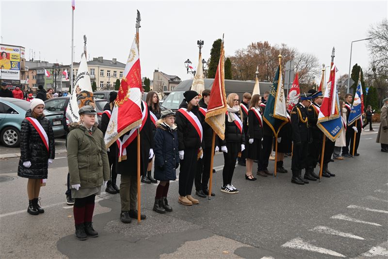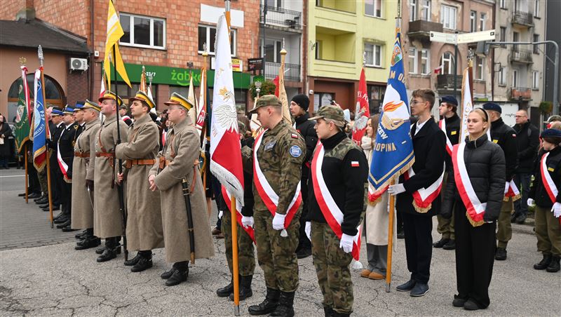 Burmistrz miasta Daniel Janiak odebrał od harcerzy symboliczny Ogień Niepodległości, który ustawiono przed popiersiem Piłsudskiego. Zebrani mieszkańcy i samorządowcy odśpiewali hymn Polski, wciągnięto flagę na maszt. Były przemówienia okolicznościowe gości, przypominające o patriotyzmie, wolności i obronie polskiej tożsamości i wiary. Odczytano apel pamięci, była salwa honorowa.