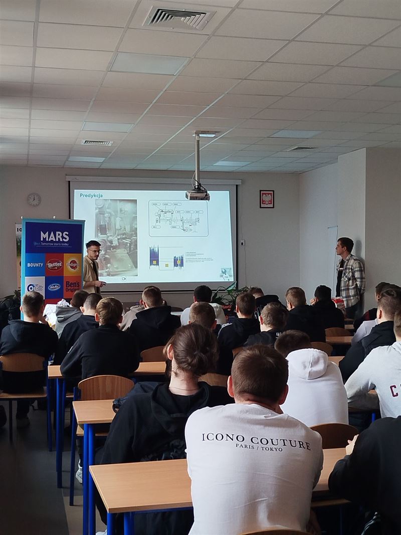 W obecnym roku szkolnym uczniowie ZS CKP mają okazję, podczas cyklu spotkań z pracodawcami, poznać firmy współpracujące ze szkołą. Jedną z nich, bardzo zaangażowaną we wspólne działania, jest Mars Polska sp. z o.o. 12 grudnia przedstawiciele firmy: Katarzyna Front (Menadżer ds. Pozyskiwania Talentów) i Michał Kramarczuk (Menadżer Działu Utrzymania Ruchu), Błażej Modrzejewski (Technik ds. Niezawodności Maszyn) i Krzysztof Mikiński (Regionalny Specjalista ds. Reputacji Pracodawcy) odwiedzili ponownie ZS CKP. Obecni na spotkaniu uczniowie z klas 4at, 3z i 1dt kształcący się w zawodach mechanik, elektryk i mechanik – monter maszyn i urządzeń zostali zapoznani z historią powstania firmy i jej strukturą organizacyjną. Mieli także możliwość wirtualnego zwiedzenia fabryki karmy dla zwierząt – zobaczenia hal i linii produkcyjnych, na których wytwarzana jest karma. Po części prezentacyjnej, przedstawiciele Marsa odpowiadali na pytania uczestników spotkania, a także zachęcali do związania swej przyszłości z firmą. Uczniów interesowało wiele aspektów pracy w firmie, rekrutacja, możliwość udziału w szkoleniach oraz warunki pracy i ścieżka zawodowa. Na wszystkie pytania zostały udzielone wyczerpujące i konkretne odpowiedzi. Na koniec spotkania odbył się interaktywny quiz. Uczestnicy spotkania, którzy wykazali się największą wiedzą na temat Mars Polska sp. z o.o. zostali nagrodzeni upominkami.