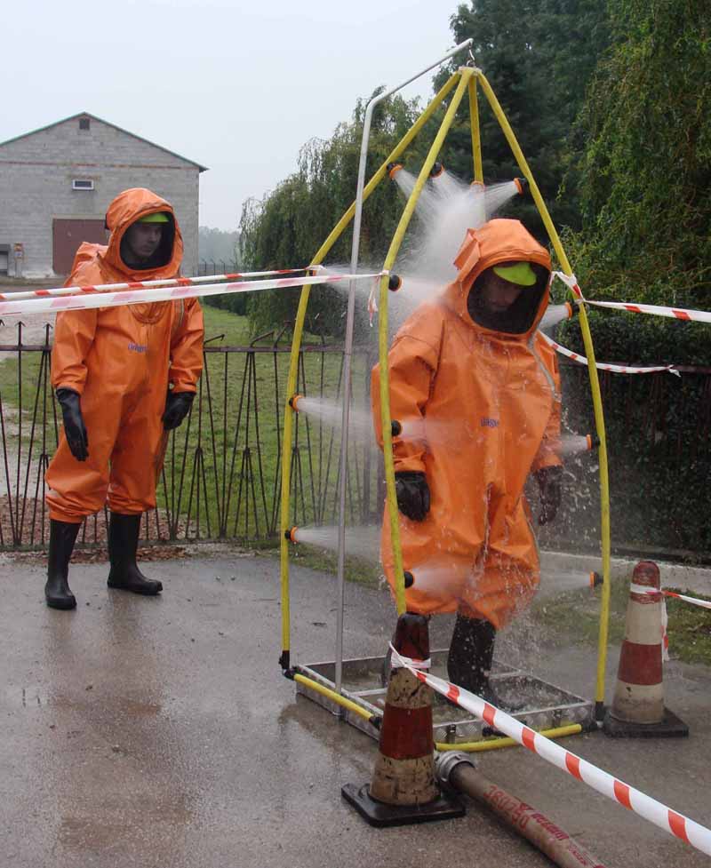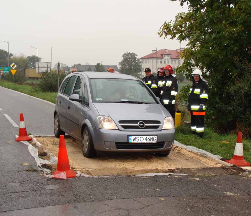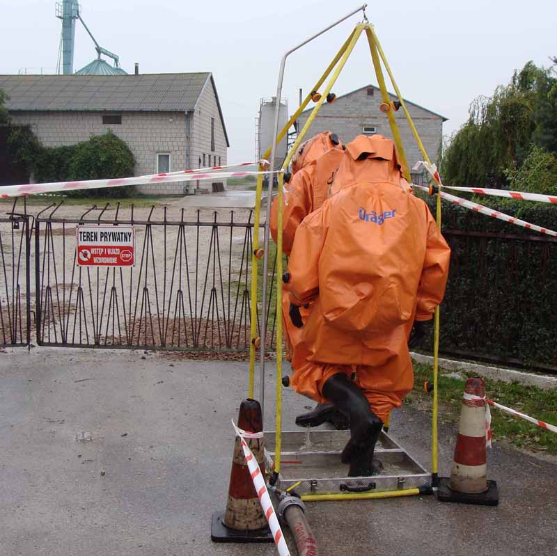 Następnie, uczestnicy udali się na teren zagrożony, gdzie odbyła się część praktyczna ćwiczeń, gdzie straż przygotowała matę dezynfekcyjną a następnie cały proces prowadzenia dezynfekcji osób wchodzących i wychodzących ze strefy zagrożenia na fermie, dokonanie pomiaru stężenia CO2 i zabezpieczenie miejsca pracy sztabu poprzez rozstawienie namiotu pneumatycznego. Na czas ćwiczeń pracownicy Powiatowego Zarządu Dróg przygotowali odpowiednią tablicę informacyjną, a policja zabezpieczała drogi i wytyczyła objazdy.