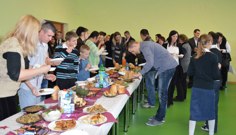Goście podzielili się opłatkiem i mieli możliwość zakupu wspaniałych dekoracji i ozdób świątecznych przygotowanych przez uczniów szkoły. Wszyscy zostali zaproszeni na poczęstunek, na który składały się pyszne tradycyjne potrawy bożonarodzeniowe.