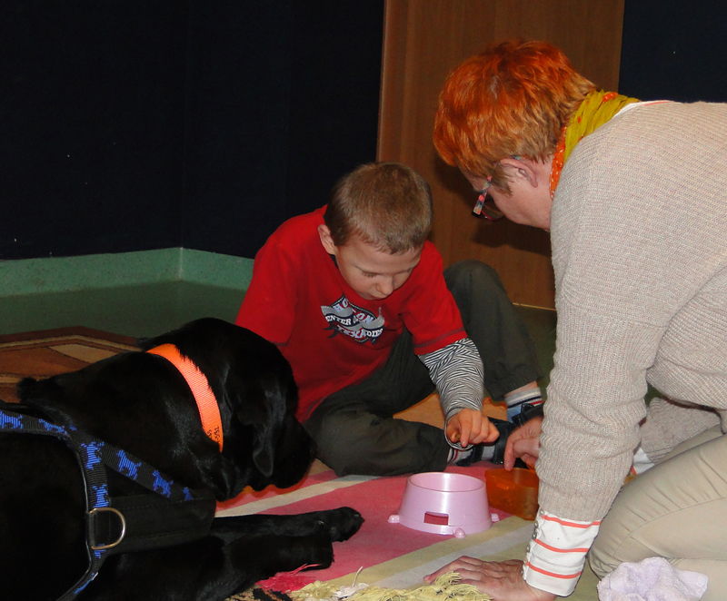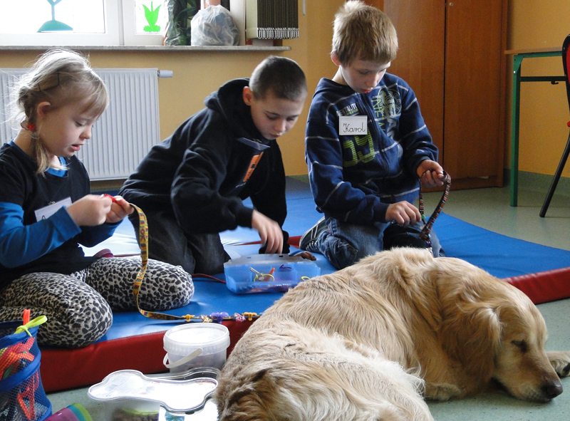 Zajęcia trwają do 40 minut, w zależności od potrzeb i zainteresowania dzieci. Prowadzą je wykwalifikowane i doświadczone kynoterapeutki z uprawnieniami pedagogicznymi – Anna Bogucka-Timofiejew i Maja E. Pruska z KynoAkademii, założycielki Stowarzyszenia Edukacji i Terapii Homo et Animal. W zajęciach biorą udział psy rasy labrador retriever oraz golden retriever. W pierwszej kolejności mali uczestnicy oswajają się ze zwierzętami. Potem karmią je psimi smakołykami, czeszą, głaskają, przytulają, wydają komendy. Wykonują też zadania przygotowane przez prowadzące, które uczą między innymi matematyki, rozpoznawania kolorów, anatomii psa. Same dzieci bardzo się cieszą, chętnie biorą udział w dogoterapii i dobrze reagują na kontakt z psem, który wywołuje u nich spontaniczną aktywność i radość.