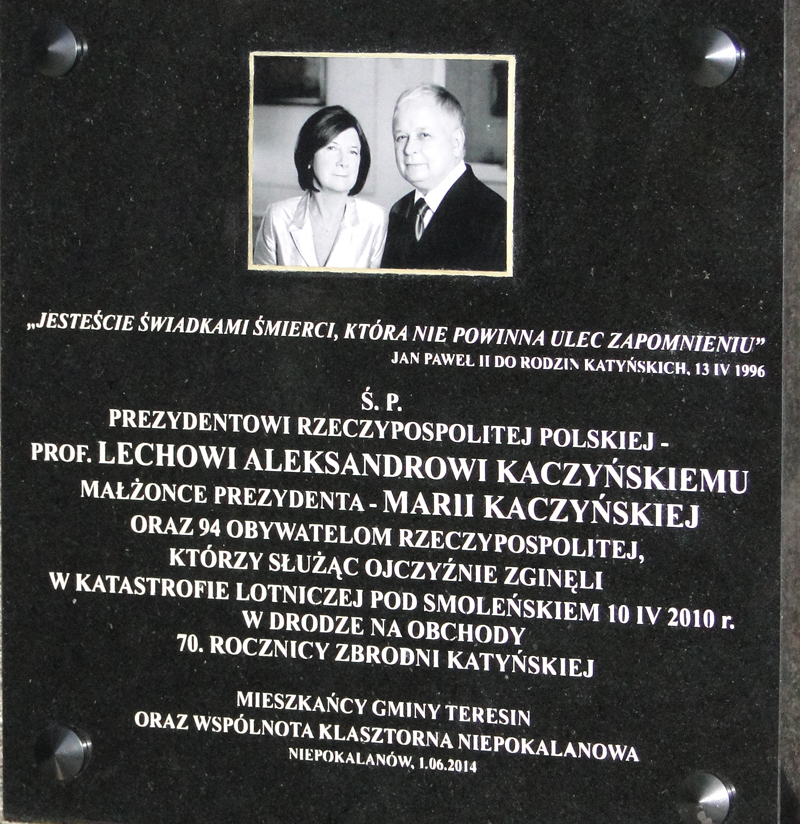W Niepokalanowie w minioną niedzielę (1 czerwca) miała miejsce uroczystość odsłonięcia tablicy upamiętniającej tragicznie zmarłych w katastrofie polskiego samolotu Tu-154M 10 kwietnia 2010 roku. Tablicę ufundowali mieszkańcy gminy Teresin i Wspólnota Klasztorna Niepokalanowa, by w ten sposób uczcić pamięć śp. Lecha Kaczyńskiego, Prezydenta RP, jego małżonki oraz pozostałych 94 ofiar, którzy, służąc Ojczyźnie, zginęli w drodze na obchody 70. rocznicy zbrodni katyńskiej. W uroczystości wziął udział Tadeusz Koryś, starosta sochaczewski.