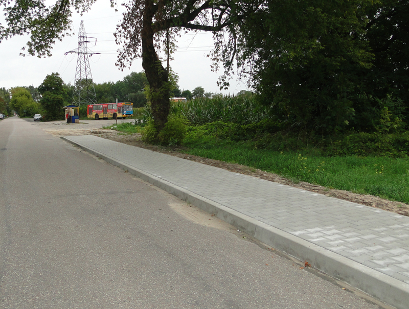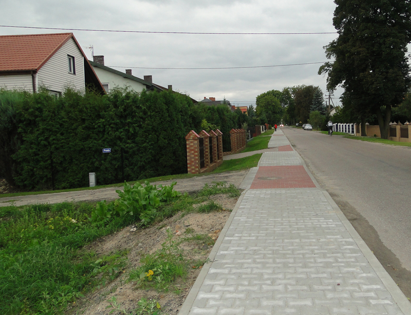 Przedmiotem zamówienia było opracowanie dokumentacji projektowej oraz budowa chodnika w ciągu drogi powiatowej w miejscowości Kozłów Biskupi. Chodnik liczy teraz około 660 m długości i 1,5 m szerokości. Układany był z szarej kostki brukowej.