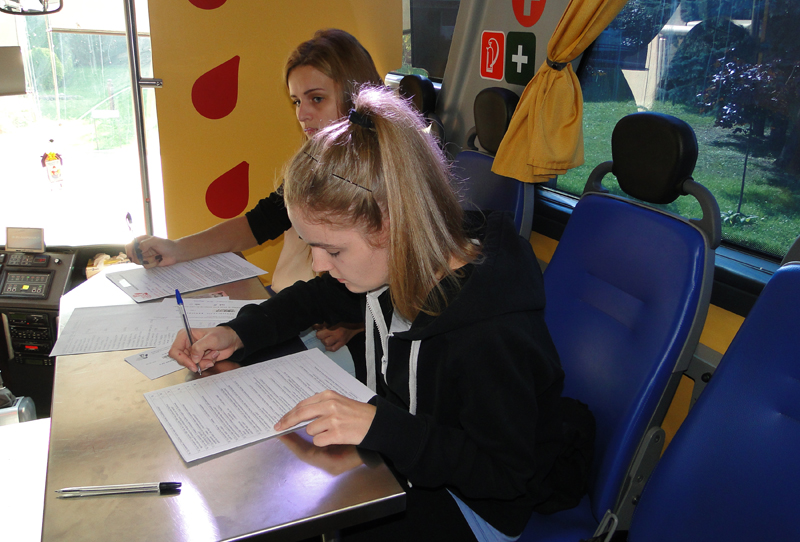 - Cieszę się, że już drugi raz w tym roku charakterystyczny czerwony autobus zawitał do naszej szkoły i że uczniowie chętnie biorą udział w akcji zbiórki krwi. Ja również oddałem dziś krew, a w ogóle łącznie oddałem już 24 litry i mogę powiedzieć, że nie ma to negatywnego wpływu na organizm. A podzielenie się darem krwi, darem życia jest najwyższą formą bezinteresownej pomocy – powiedział Tomasz Obrączka, dyrektor ZS RCKU.