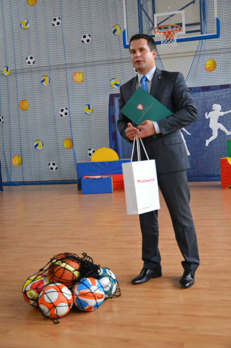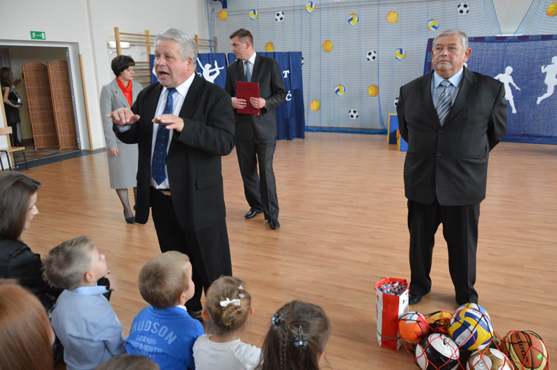 Starosta Tadeusz Koryś wręczył dyrektor szkoły Ewie Kamińskiej zestaw piłek do gry, które z pewnością zostaną wykorzystanie podczas zajęć sportowych w nowo oddanej hali. Ponadto starosta przekazał pamiątkowy drzewiec.