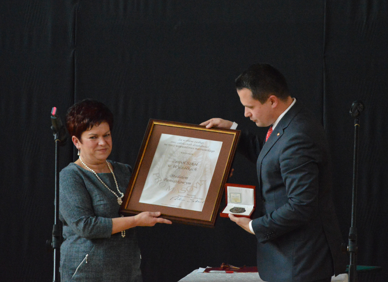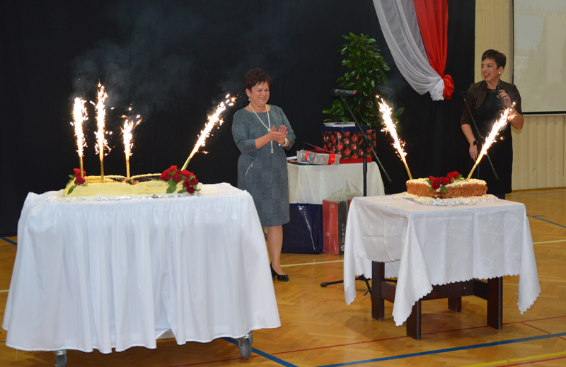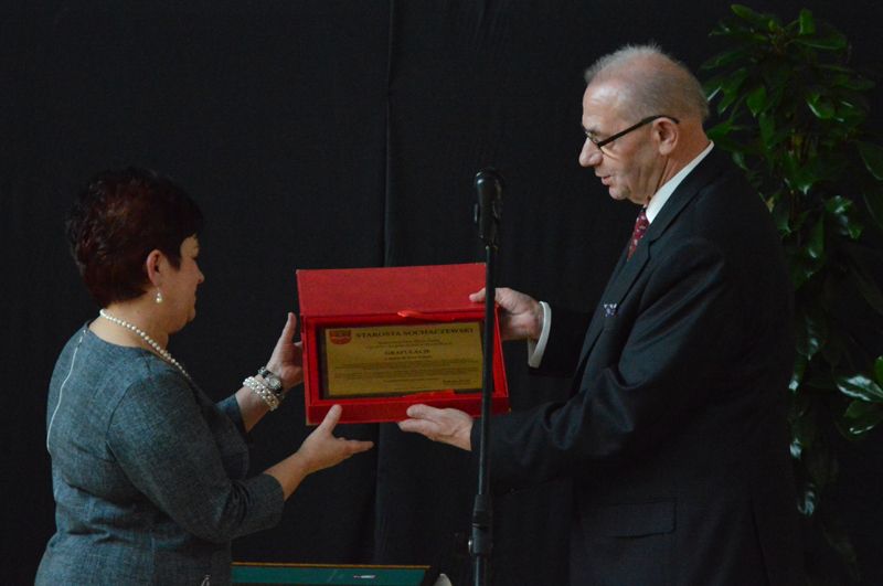 Po zakończeniu programu przyszedł czas na gratulacje, podziękowania i życzenia. Starosta Tadeusz Koryś, dziękując za piękną uroczystość, wręczył dyrektor Alicji Gałaj pamiątkowy grawerowany drzewiec, dodając, że upominek Starostwo Powiatowe przekazało wcześniej, a był to trójdzielny parawan, który szkoła wykorzystała do przygotowania specjalnie na tę okazję wystawy fotograficznej prezentującej dzieje szkoły. – Dziękuję za rozsławianie powiatu sochaczewskiego, za wychowanie oraz edukację wielu pokoleń dzieci i młodzieży, a także dobre przygotowanie ich do dalszej drogi życiowej. Gronu pedagogicznemu życzę zaangażowania i niesłabnącego zapału, które z pewnością zaowocują dalszym rozwojem szkoły otwartej na marzenia i potrzeby uczniów. Uczniom życzę, by, budując swoją przyszłość, z entuzjazmem i radością odkrywali tajniki wiedzy. Całej społeczności szkolnej zaś chciałbym złożyć życzenia dalszych sukcesów, wspaniałych osiągnięć i kolejnych pięknych jubileuszy – mówił starosta T. Koryś.