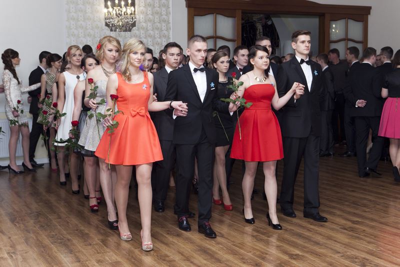 Chyba już do przeszłości należą czasy, gdy dziewczyny na tę wyjątkową okazję zakładały czarne spódniczki i białe bluzki. W tym roku było krótko, kolorowo i błyszcząco! Sukienki – rzadko małe czarne, a jeśli już to w mniejszości i raczej wśród grona pedagogicznego, uczennice postawiły na szerokie, czasem sztywne spódnice z różnych tkanin, wśród których był też studniówkowe hity: pianka albo tiul! Obcasy powyżej 10 cm – przynajmniej na początku, potem wymienione zostały na baleriny. Fryzury: loki! Dużo loków – ze skłonnością do gromadzenia ich po jednej stronie głowy - i trochę koków, jak zawsze, do tego mocny makijaż oraz długie, kolorowe paznokcie. Jeśli chodzi o panów postawili na klasykę, czyli garnitury, a jedyną ekstrawagancją, na jaką niektórzy sobie pozwolili, były czerwone sznurówki.