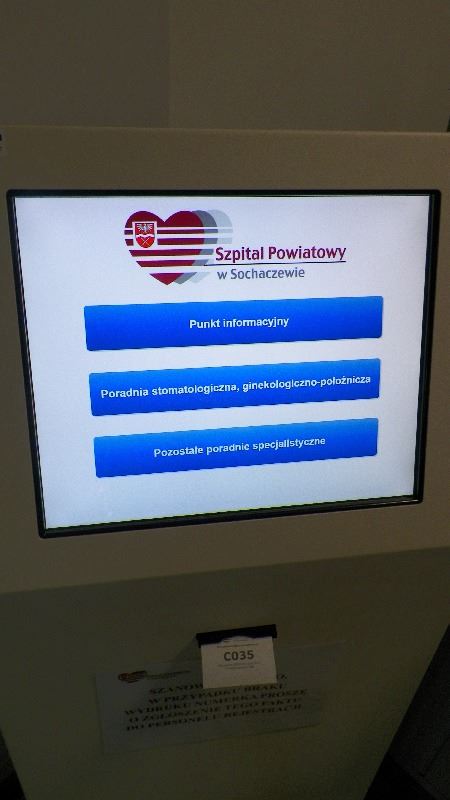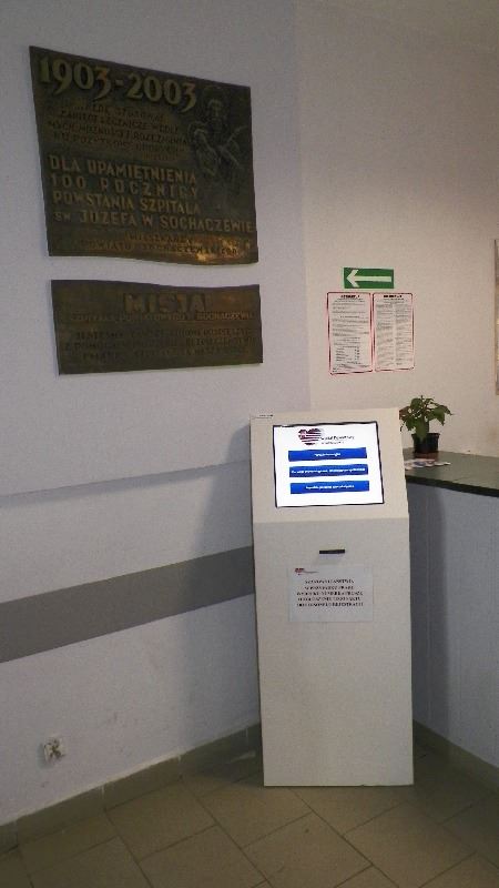 Miło nam poinformować, że od 18 maja 2015 roku w Zespole Opieki Zdrowotnej „Szpitala Powiatowego” w Sochaczewie usprawniliśmy pracę rejestracji poradni specjalistycznych poprzez umiejscowienie numerkomatu. W holu głównym przy szatni znajduje się urządzenie, które automatycznie ustala kolejność obsługi każdego pacjenta, a następnie zaprasza go do odpowiedniego stanowiska poprzez wyświetlenie numeru na specjalnie przeznaczonym do tego celu monitorze oraz poprzez nadanie komunikatu głosowego.