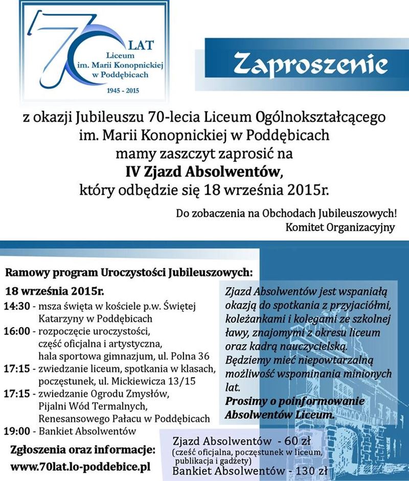 Z okazji 70–lecia Liceum Ogólnokształcącego im. Marii Konopnickiej w Poddębicach 18 września 2015 roku organizowany będzie IV Zjazd Absolwentów. W związku z tym wydarzeniem Starostwa Powiatowego w Poddębicach zwraca się za naszym pośrednictwem o nagłośnienie tego wydarzenia – być może wśród naszych mieszkańców są absolwenci tejże szkoły.