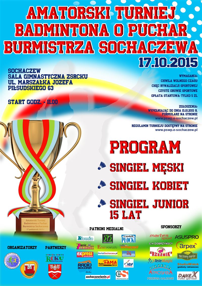 Zachęcamy do udziału w pierwszym Amatorskim Turnieju Badmintona o puchar burmistrza Sochaczewa, który rozegrany zostanie w sobotę, 17 września na sali sportowej ZS RCKU. Początek zawodów godz. 11.00. Do turnieju mogą zgłaszać się wszyscy, bez ograniczeń wiekowych, ale nieposiadających aktualnej Licencji PZBad.