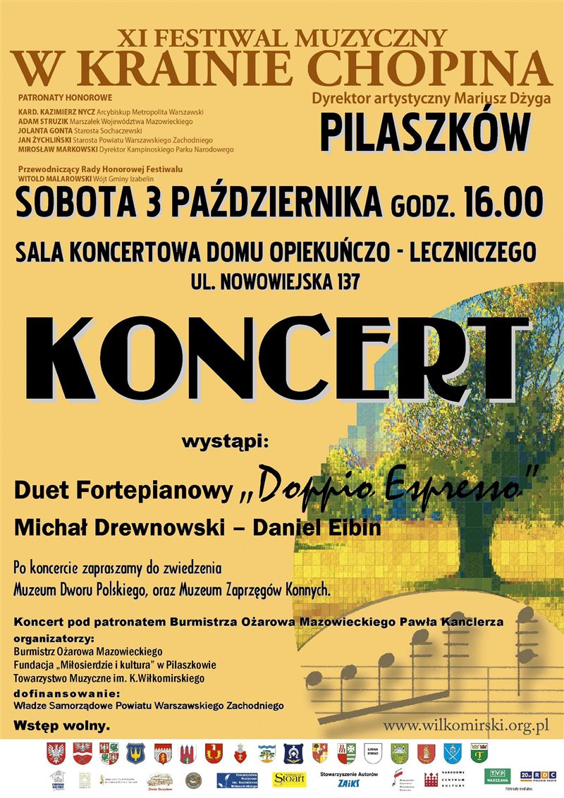 W najbliższą sobotę 3 października zapraszamy do kompleksu opiekuńczo-artystycznego w Pilaszkowie. O godzinie 16.00 w sali koncertowej Domu Opiekuńczo-Leczniczego wystąpi Duet fortepianowy „Doppio Espresso” w składzie: Michał Drewnowski i Daniel Eibin, którzy wykonają utwory: W. A. Mozarta, G. Bizeta, E. Griega, A. Chaczaturiana, A. Piazzolli, w niezwykle ciekawym opracowaniu na cztery ręce. Po koncercie, słuchacze będą mogli zwiedzić z przewodnikiem Muzeum Dworu Polskiego mieszczące się w dworze w Pilaszkowie, oraz największe na Mazowszu, Muzeum Pojazdów Konnych. Dwór otoczony jest klasycystycznym, XVIII wiecznym parkiem krajobrazowym, w którym znajdują się rzadkie i cenne okazy przyrody.