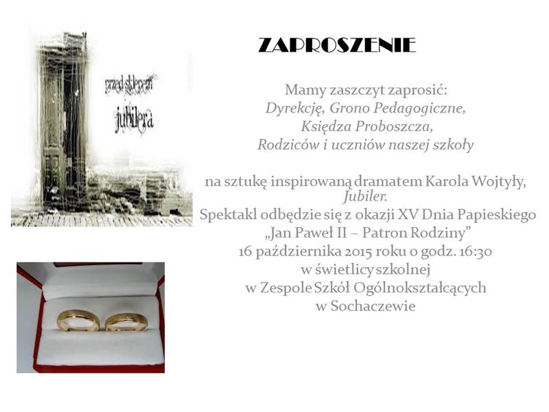 Społeczność Zespołu Szkół Ogólnokształcących w Sochaczewie zaprasza na prezentację sztuki teatralnej inspirowanej dramatem Karola Wojtyły „Jubiler”. Spektakl odbędzie się z okazji XV Dnia Papieskiego „Jan Paweł II – Patron Rodziny” w piątek 16 października br. w świetlicy szkolnej. Początek o godz. 16.30.