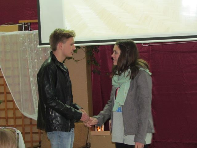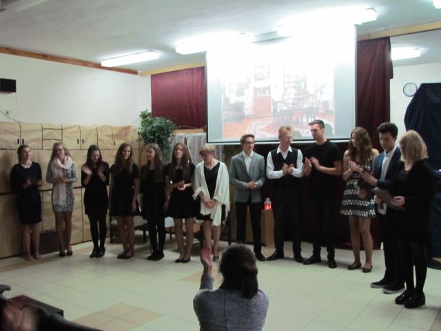 Okazją do wystawienia sztuki był Dzień Papieża Jana Pawła II, obchodzony co roku 16 października, polskie święto, ustanowione przez Sejm Rzeczpospolitej Polskiej w hołdzie papieżowi–Polakowi. Zważywszy na porę dnia i tygodnia, publiczność dopisała. Obecny był dyrektor Dariusz Miłkowski, ks. Robert Sumiński z parafii w Boryszewie, nauczyciele, rodzice, a także uczniowie, którzy przybyli podziwiać swoich kolegów i koleżanki. Główne role w przedstawieniu zagrali Zuzanna Ziarek (Teresa), Mikołaj Martinek (Andrzej), Aleksandra Niewiadomska (Monika) i Adrian Boczkowski (Krzysztof). W rolach drugoplanowych wystąpili: Michał Kaźmierczak, Michał Woźniak, Piotr Pisarek i Patrycja Adamiak. Nad całokształtem przedsięwzięcia czuwała pani Justyna Kwiatkowska–Kornatko, nauczycielka religii.
