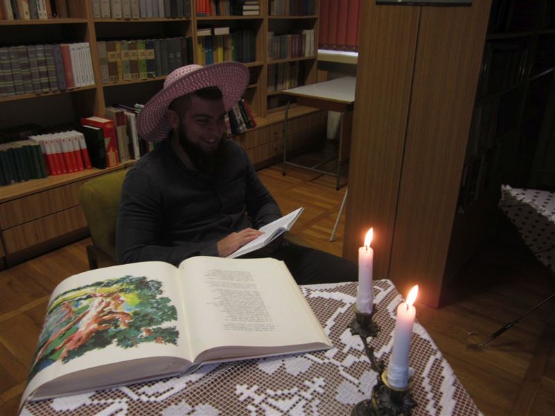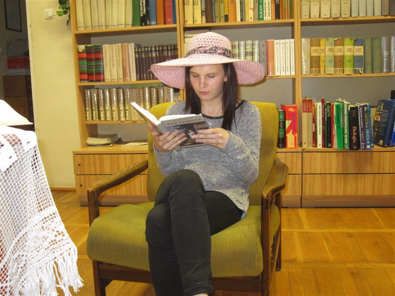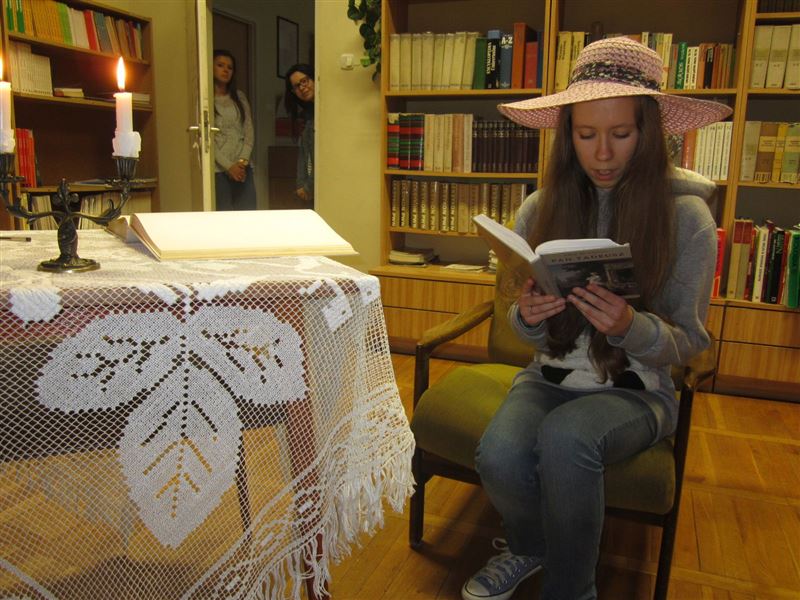 Już po przekroczeniu jej progu można było odnieść wrażenie, że jest jakby odcięta od naszej szarej rzeczywistości. W sali unosił się przyjemny, słodki zapach, w głębi panował lekki półmrok. Stanowisko czytającego rozświetlały świece, które potrafią zapewnić odpowiedni klimat praktycznie wszędzie, jednak w trosce o oczy lektorów wspomagała je nasza zwykła, współczesna żarówka. Pojawiły się także inne rekwizyty, które miały nam pomóc w przeniesieniu się w czasy „Pana Tadeusza", parasolka, kapelusz, który zakładali lektorzy, aby upodobnić się do dam z tamtego okresu, czy koronkowa serweta.