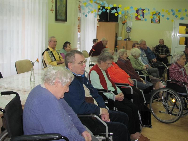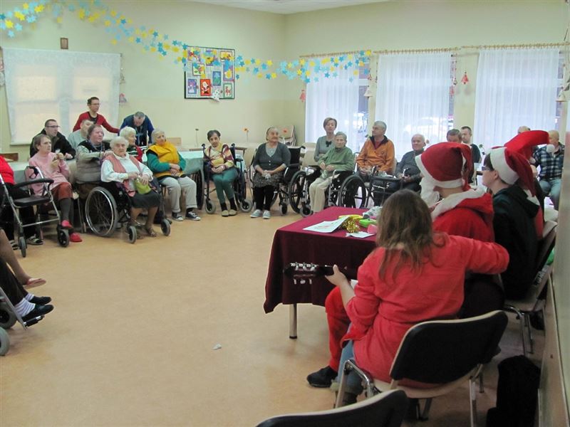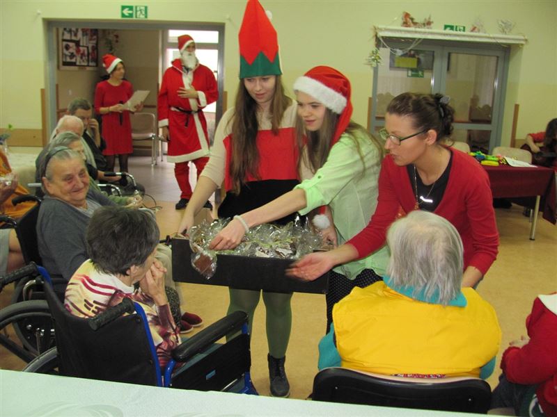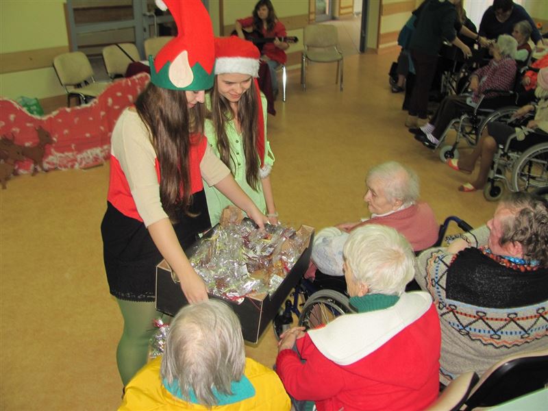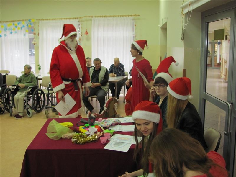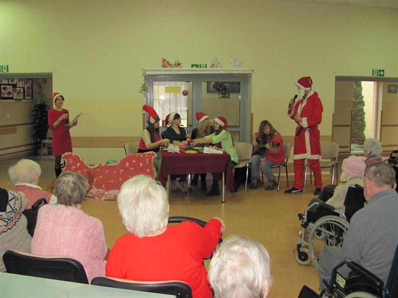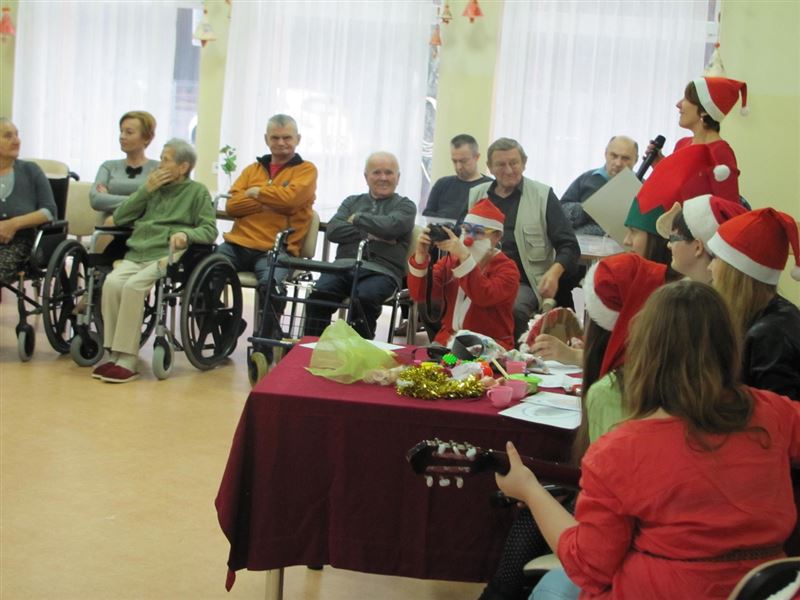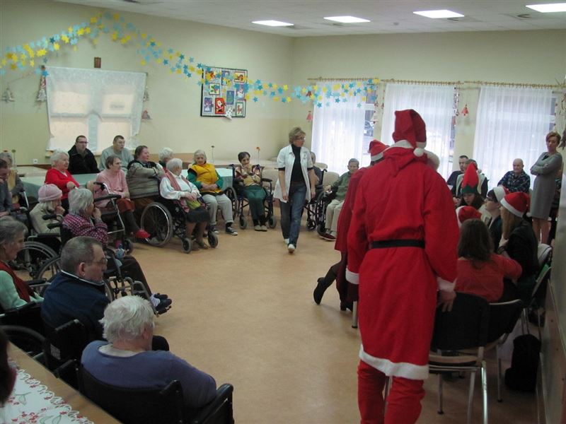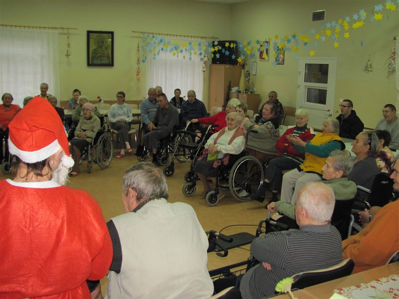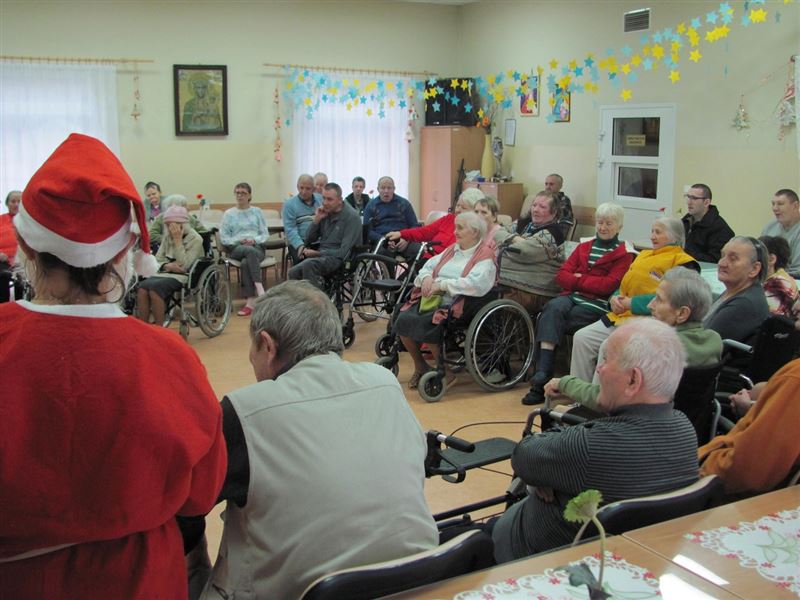 W piątek 18 grudnia w godzinach przedpołudniowych odwiedziła nas młodzież z Zespołu Szkół Rolnicze Centrum Kształcenia Ustawicznego w Sochaczewie z występem świątecznym. Młodzież przebrana w stroje elfów oraz Świętego Mikołaja zaprezentowała jak tworzone i rozwożone są prezenty. Święty nie zapomniał o naszych mieszkańcach i sprezentował im podarunki, jakimi były własnoręcznie pieczone i ozdabiane pierniki. Mieszkańcy odwdzięczyli się słodkim poczęstunkiem. Po występie nastąpiło wspólne śpiewanie kolęd i składanie życzeń świątecznych.