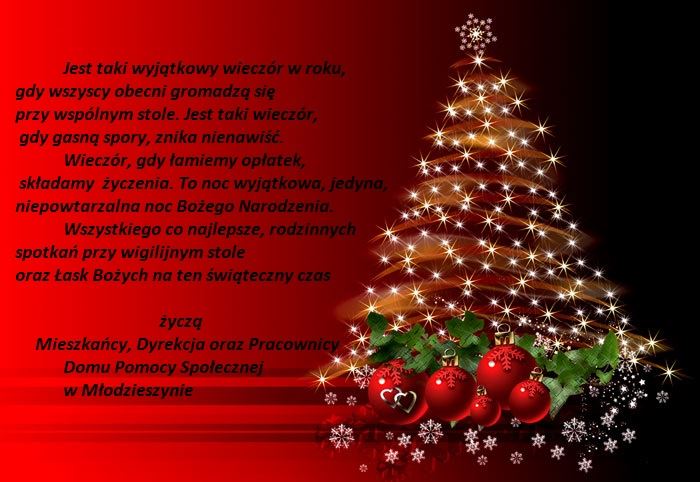 W dniu 22 grudnia 2015 roku w Domu Pomocy Społecznej w Młodzieszynie miała miejsce uroczysta Wieczerza Wigilijna dla Mieszkańców Domu oraz osób zaproszonych. Wśród gości byli między innymi: Pan Tadeusz Głuchowski - Wicestarosta Powiatu Sochaczewskiego, Pani Tereasa Pawelak – Skarbnik Powiatu, Pan Andrzej Grabowski – Członek Zarządu Powiatu Sochaczewskiego, Pani Monika Wideńska – Wiceprzewodnicząca Rady Powiatu, Katarzyna Kajak – Dyrektor PCPR w Sochaczewie, Hanna Mielcarz – Dyrektor Zespołu Szkół Specjalnych w Erminowie, Renata Karaś – pedagog w Zespołu Szkół Specjalnych w Erminowie, Agnieszka Ambroziak – Dyrektor Młodzieżowego Ośrodka Wychowawczego w Załuskowie, Beata Duda – Wicedyrektor Młodzieżowego Ośrodka Wychowawczego w Załuskowie, Monika Pietrzyk -Połubińska – Wójt Gminy Młodzieszyn, Małgorzata Zawadzka – Skarbnik Gminy Młodzieszyn, Mariola Winnicka – Kierownik Gminnego Ośrodka Pomocy Społecznej w Młodzieszynie oraz księża - Ksiądz Proboszcz Parafii w Młodzieszynie Dariusz Kuźmiński oraz ksiądz Andrzej Kita. Oprawę muzyczną w postaci śpiewanych kolęd zapewniały dzieci ze Scholi przy Parafii w Młodzieszynie pod opieką Pani Beaty Ciura.