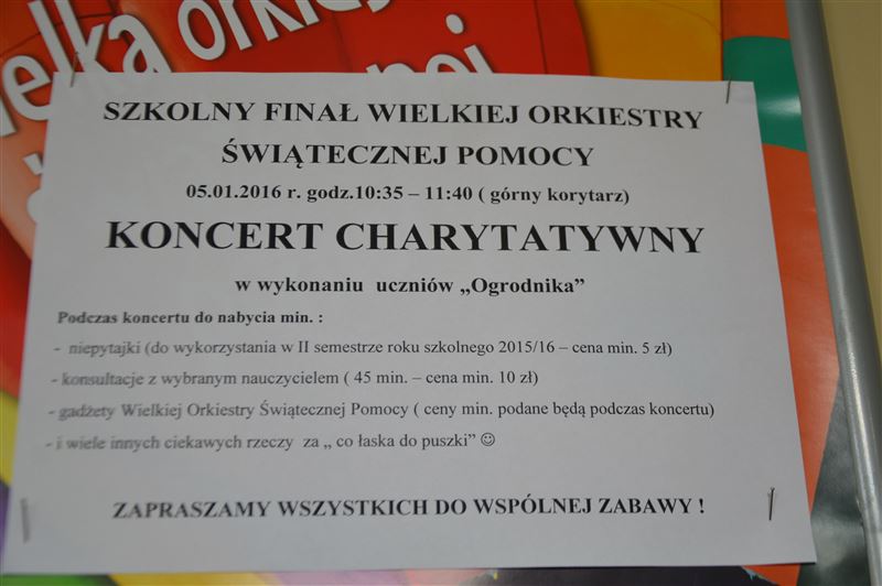 Początek roku w „Ogrodniku” rozpoczął się koncertowo. Samorząd Uczniowski pod opieką Marka Wernickiego oraz Beaty Domańskiej przygotował koncert muzyczny, podczas którego zbierane były pieniądze na rzecz Wielkiej Orkiestry Świątecznej Pomocy. W czasie występu licytowane były przedmioty, które otrzymaliśmy od szefa sztabu Orkiestry z Gimnazjum Nr 2 w Sochaczewie Anny Torzewskiej – koszulkę, album i płytę. Łącznie w czasie jednej godziny lekcyjnej udało się zebrać 390 zł.