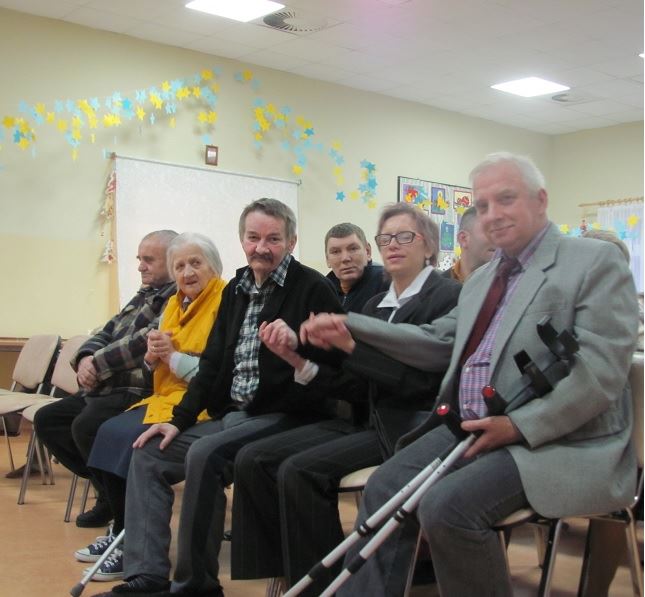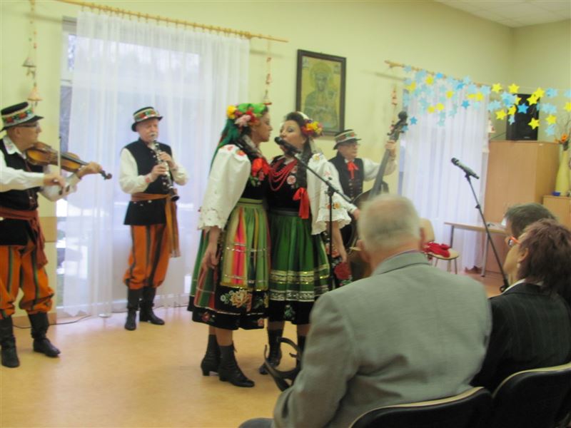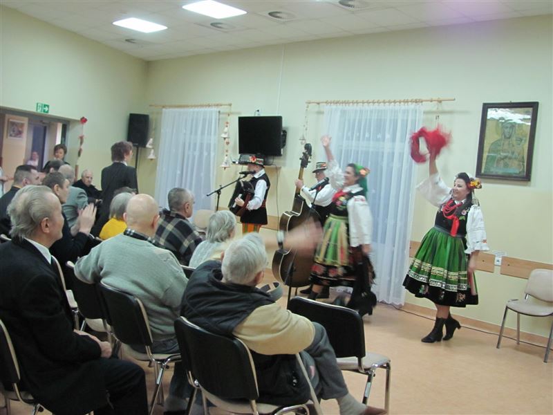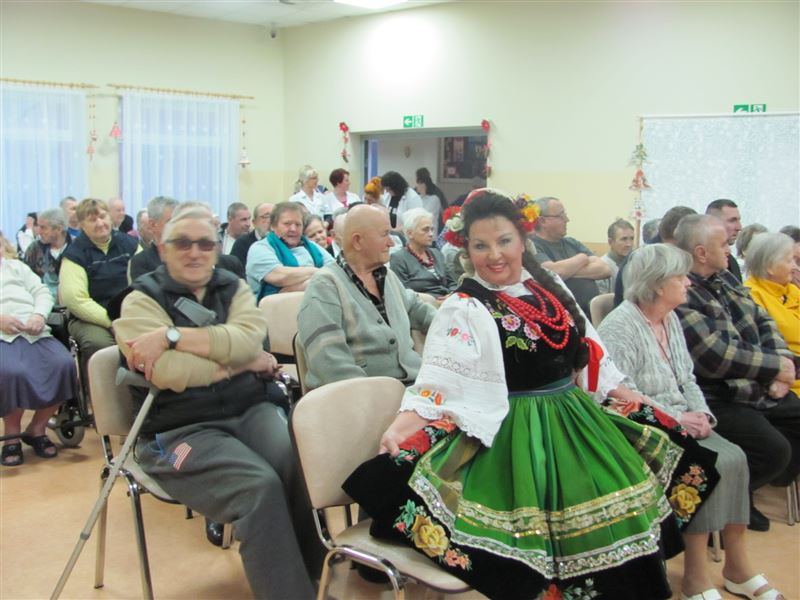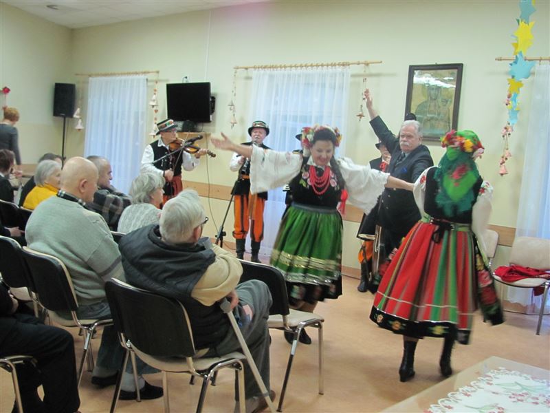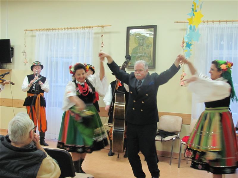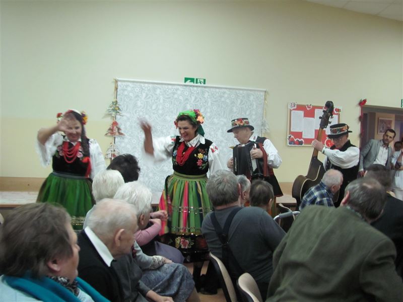 Nie obyło się również bez śpiewania pieśni ludowych, które poderwały do tańca osoby zgromadzone na sali. Mieszkańcy wraz z pracownikami chętnie włączyli się do wspólnego śpiewania. Spotkanie wywołało u mieszkańców uśmiech na twarzach, wiele pozytywnych emocji i radości.