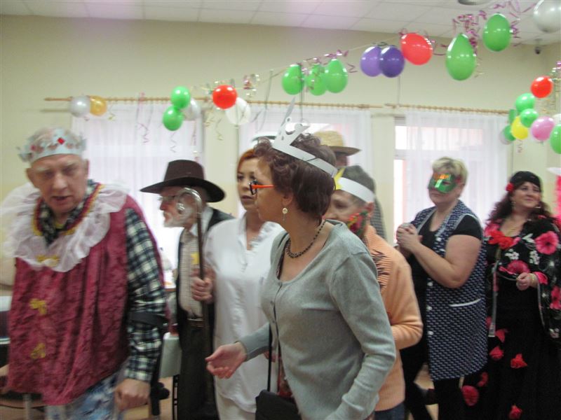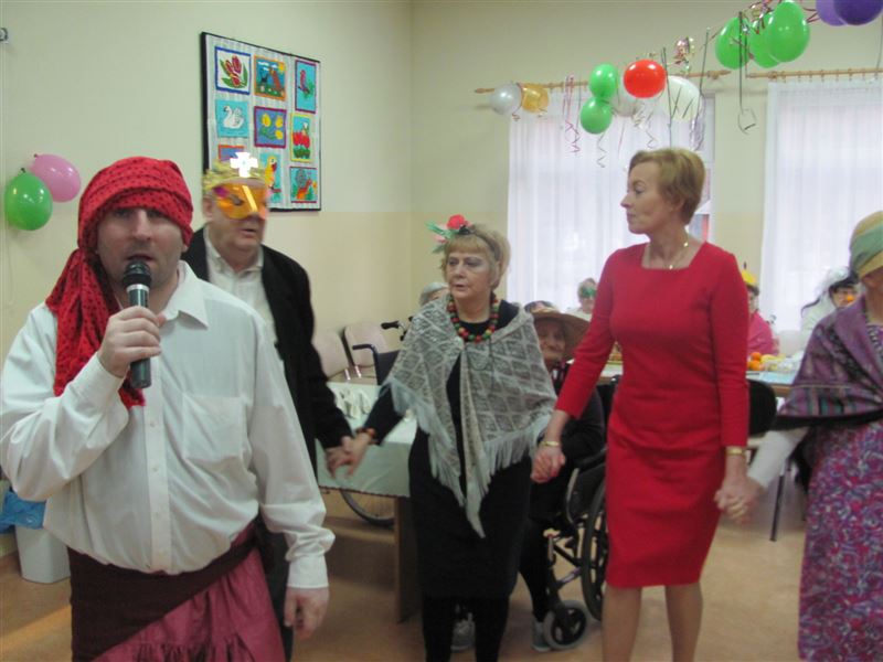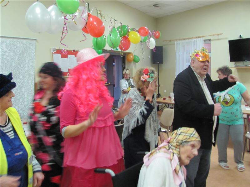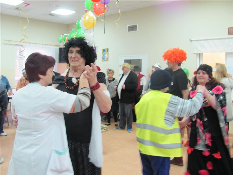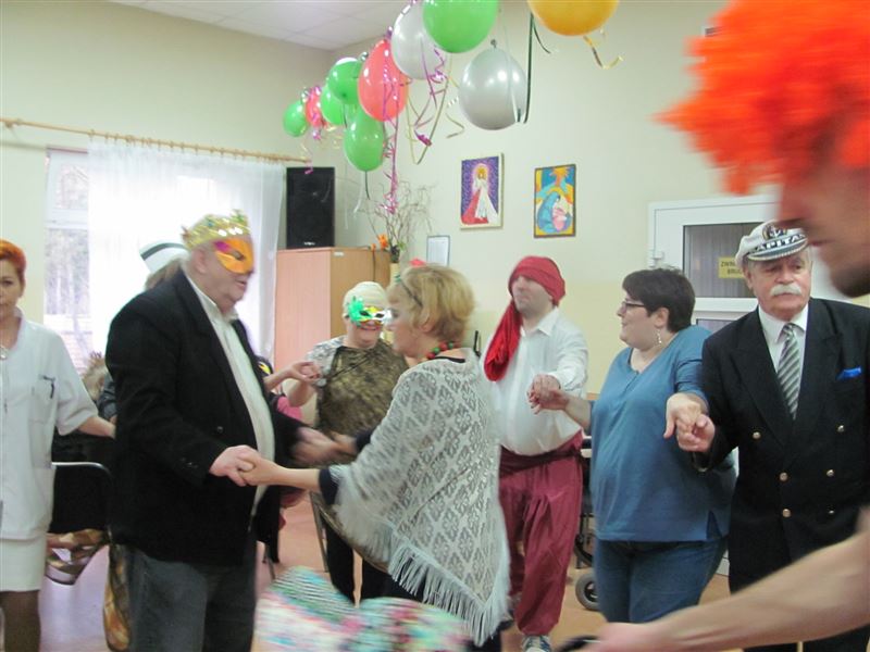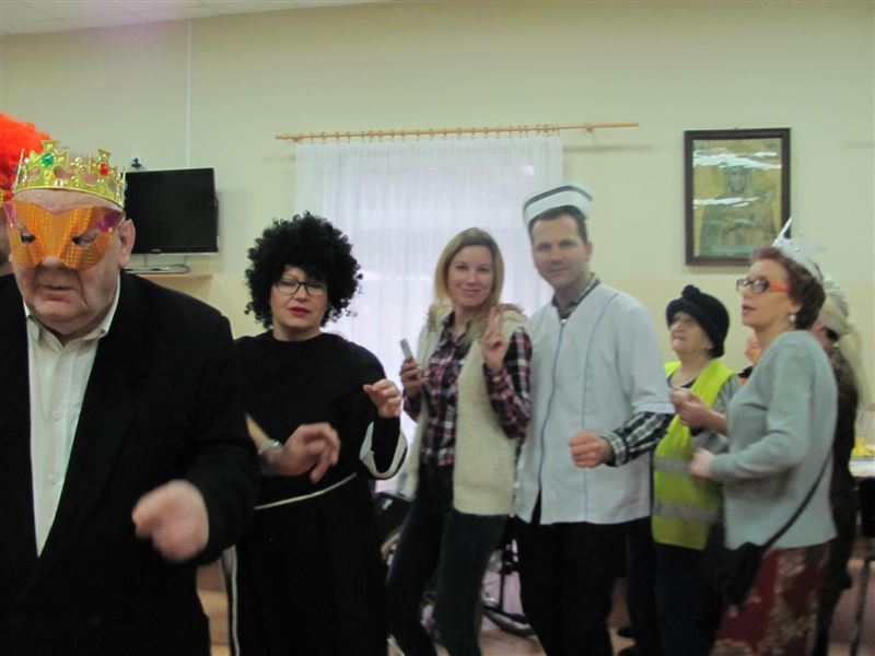 Na parkiecie przy dźwiękach najróżniejszych przebojów brylowały: księżniczki, królowie, baletnice, kowboje. W przebraniach pielęgniarek, zakonnicy, pirata i wielu innych, w maseczkach i okularach, wspólnie bawili się mieszkańcy Domu wraz z pracownikami. W szampańskim humorze i doskonałych nastrojach spędziliśmy taneczne popołudnie bawiąc się wyśmienicie. Przy okazji przy mikrofonie zaśpiewaliśmy również wspólnie z wielką chęcią klika piosenek.