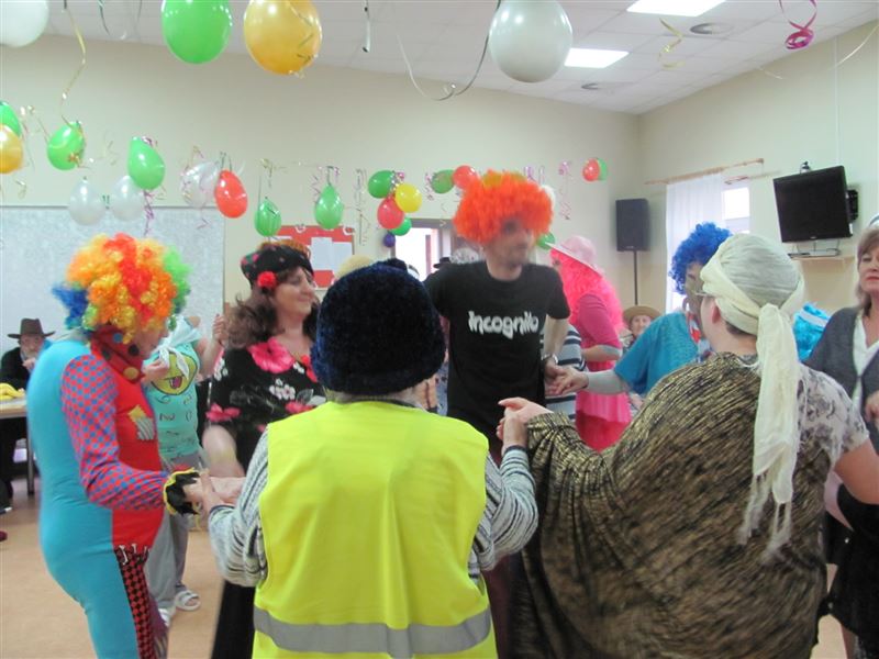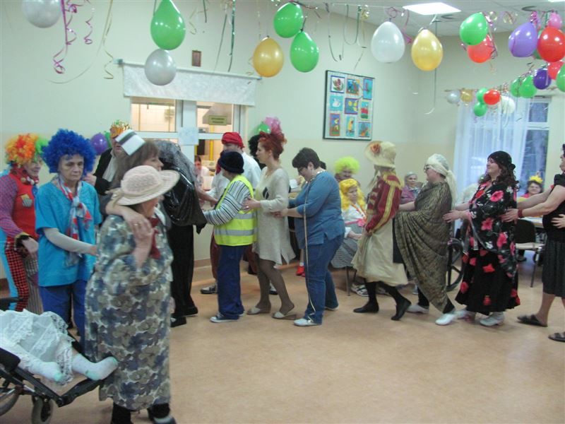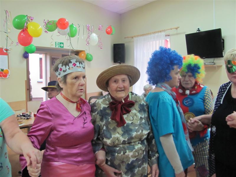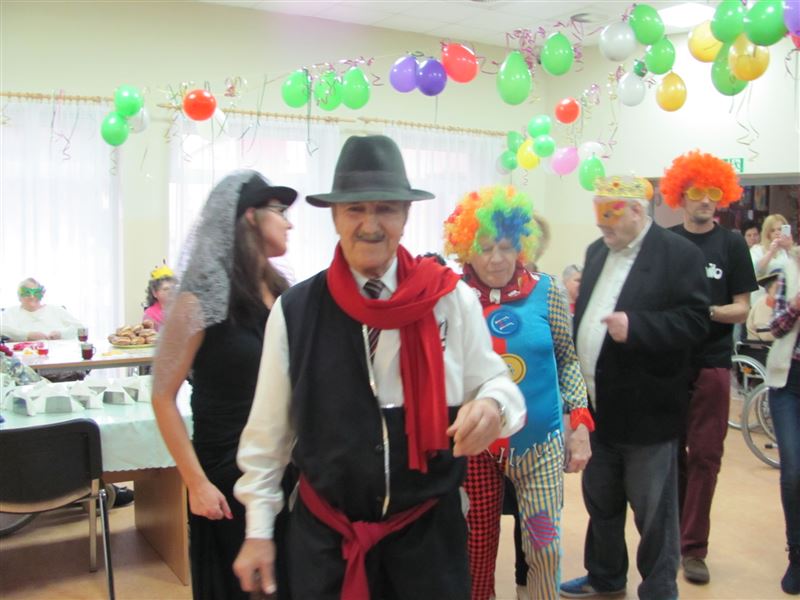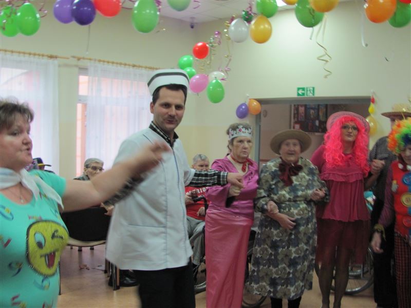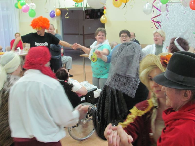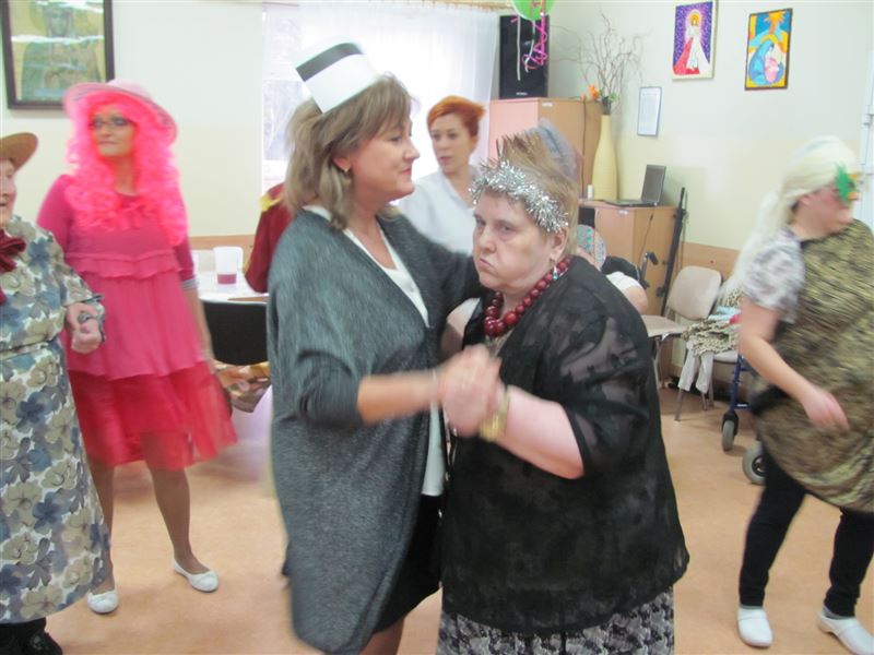 Na parkiecie przy dźwiękach najróżniejszych przebojów brylowały: księżniczki, królowie, baletnice, kowboje. W przebraniach pielęgniarek, zakonnicy, pirata i wielu innych, w maseczkach i okularach, wspólnie bawili się mieszkańcy Domu wraz z pracownikami. W szampańskim humorze i doskonałych nastrojach spędziliśmy taneczne popołudnie bawiąc się wyśmienicie. Przy okazji przy mikrofonie zaśpiewaliśmy również wspólnie z wielką chęcią klika piosenek.