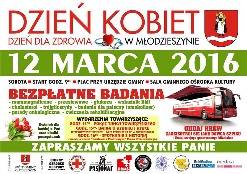 Wójt gminy Młodzieszyn Monika Pietrzyk-Połubińska zaprasza wszystkie Panie 12 marca w sobotę, od godz. 9.00 do Młodzieszyna (ul. Wyszogrodzka 25 – teren przy Urzędzie Gminy i sala Gminnego Ośrodka Kultury) na wspólne świętowanie z okazji Dnia Kobiet. W tym roku obchodzimy go pod hasłem „Dzień dla zdrowia”.