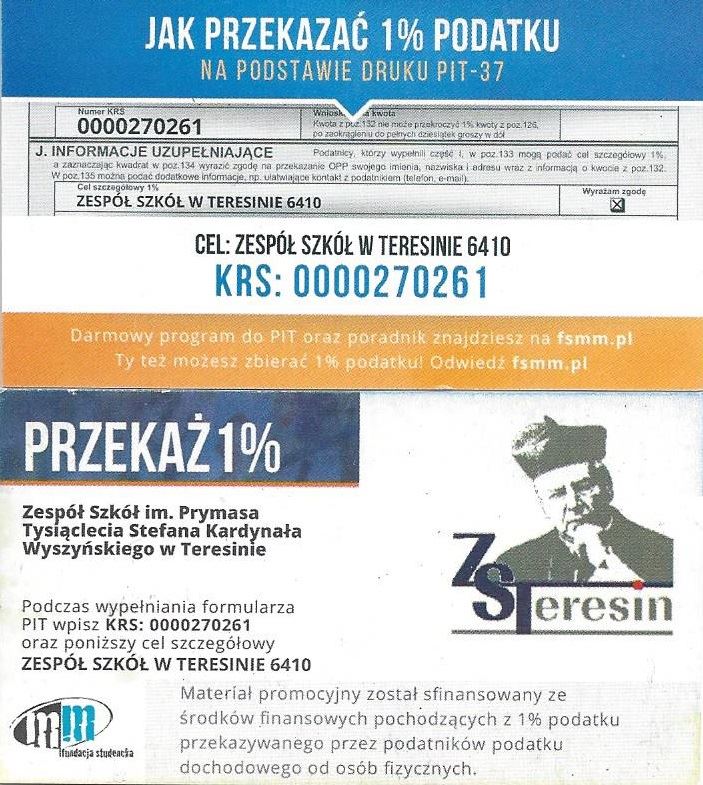 Ci, którzy nie rozliczyli się jeszcze z podatku dochodowego, a nie mają określonego celu, jeśli chodzi o podarowanie 1% mogą przyczynić się do rozwoju Zespołu Szkół w Teresinie. Przypominamy, że w dalszym ciągu można wesprzeć tę zasłużoną i rozwijającą się placówkę, jedyną publiczną szkołę ponadgimnazjalną na terenie powiatu sochaczewskiego zlokalizowaną poza Sochaczewem.
