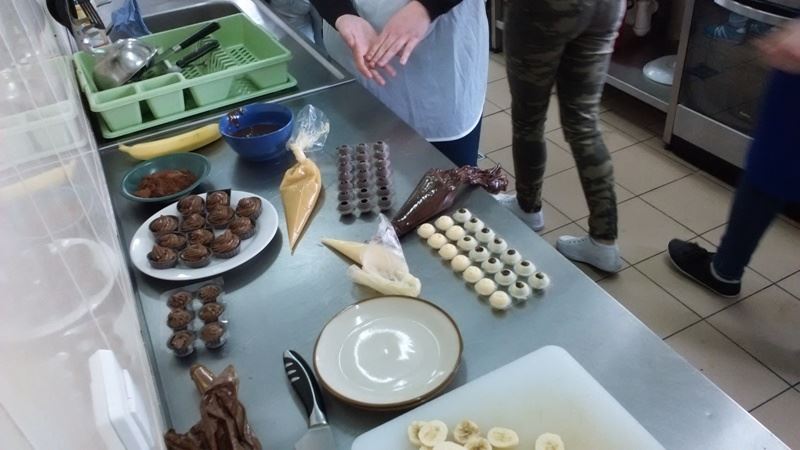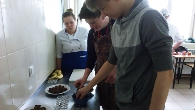 W ostatnią środę kwietnia w pracowni gastronomicznej w Zespole Szkół im. Jarosława Iwaszkiewicza gościliśmy uczniów klas trzecich Gimnazjum w Kampinosie. Mili goście pod czujnym okiem uczniów klas drugich technikum żywienia i usług gastronomicznychoraz dzięki profesjonalnemu instruktażowi poznali tajniki pracy z czekoladą. Efektem tych zmagań były czekoladowe trufle z nadzieniem kokosowym, chałwowym, czekolady z chili i foremki czekoladowe wypełnione czekoladowym musem. Na stole pojawiły się również naleśniki z bananami i czekoladą. Nad przebiegiem prac czuwała pani Dorota Waszczeniuk - nauczyciel przedmiotów gastronomicznych.