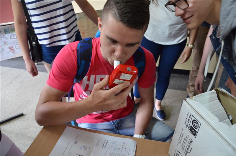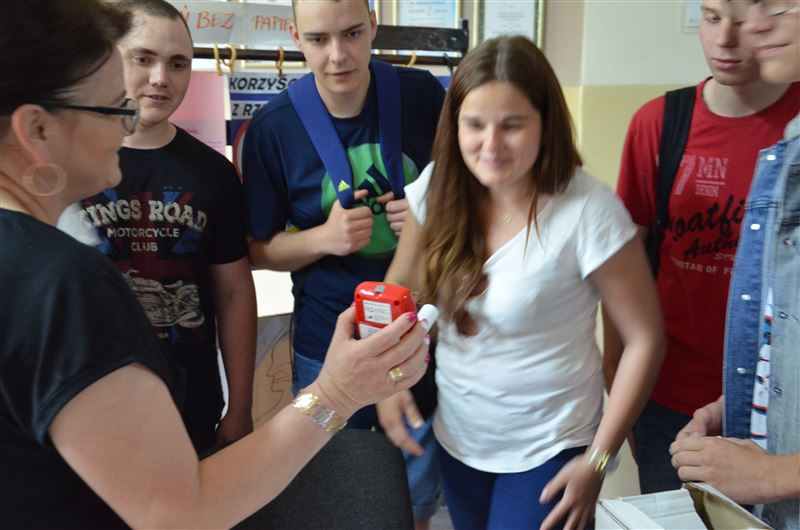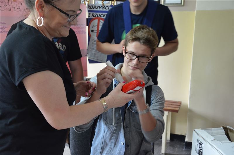 31 marca to Światowy Dzień Rzucania Palenia i to był pretekst do zaproszenia na specjalny pokaz w Zespole Szkół Centrum Kształcenia Praktycznego Pani Renaty Gajdy z Sochaczewskiego SANEPID-u. Dzięki niej można było skontrolować zawartość CO w wydychanym powietrzu, czyli można było dokonać specjalnego pomiaru. Ci, którzy palą papierosy mogli sprawdzić, na jakim są etapie, czy mają jeszcze wynik w granicach normy, czy już dawno tę normę przekroczyli. Oczywiście badaniu poddawali się nie tylko palacze! Nie należy ono do skomplikowanych. Urządzenie służące do sprawdzenia zawartości CO w wydychanym powietrzu przypomina alkomat. Badany bierze głęboki oddech, a następnie dmucha właśnie do tego urządzenia. Osoby palące albo przebywające wśród palaczy nigdy nie mają wyniku w normie. Ci, którzy sięgają po papierosa mogli sprawdzić, czy to już pełne uzależnienie, czy dopiero „złego początki”. Niektórzy z badających się, byli zaskoczeni, że normy nie spełniają. Wyników nie podajemy! Czas więc rzucić palenie!