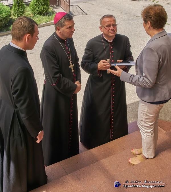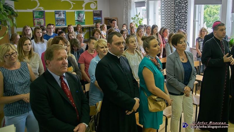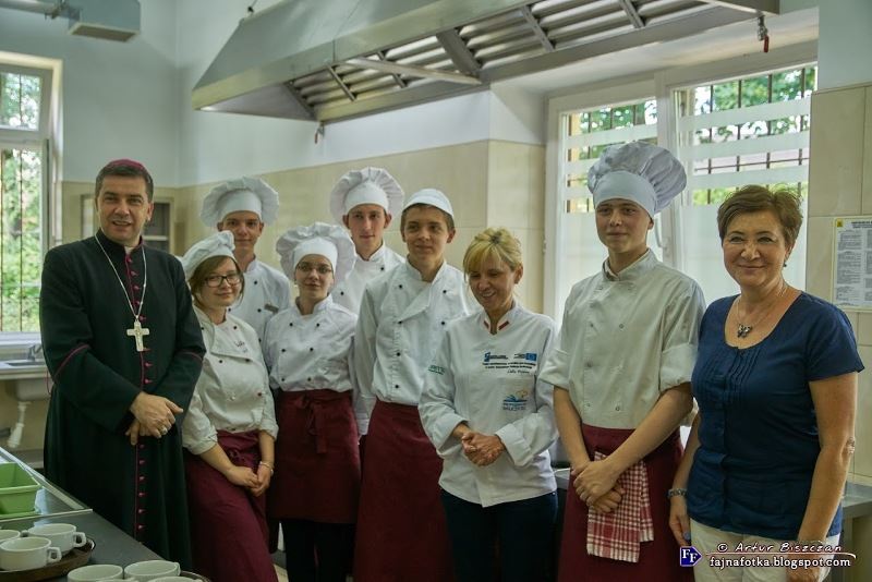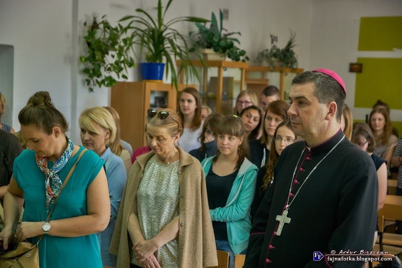 Podziękował również pracownikom szkoły za kształtowanie osobowości młodych ludzi i udzielił obecnym pasterskiego błogosławieństwa. Na zakończenie przyjął od młodzieży życzenia i kwiaty oraz wpisał się do kroniki szkolnej. Było to niezwykle wzruszające wydarzenie w życiu społeczności szkolnej. Po części oficjalnej Ksiądz Biskup został zaproszony na obiad przygotowany przez uczniów klas gastronomicznych w Zespole Szkół im. Jarosława Iwaszkiewicza.