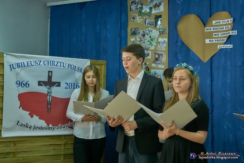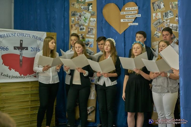 Po powitaniu niecodziennego gościa przez dyrektora szkoły - Panią Hannę Bonecką uczniowie i pracownicy szkoły zebrani w świetlicy szkolnej obejrzeli program oparty na nauce św. Jana Pawła II „Nie żyje się, nie kocha się, nie umiera się - na próbę”.