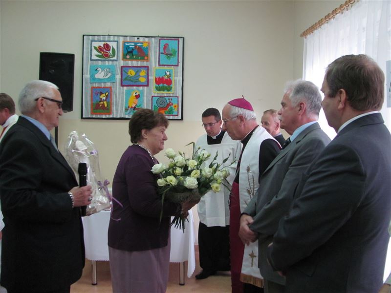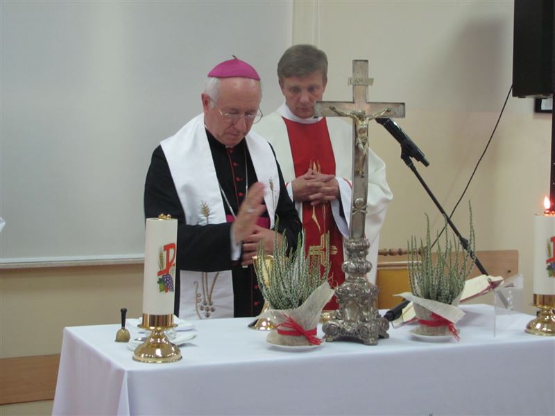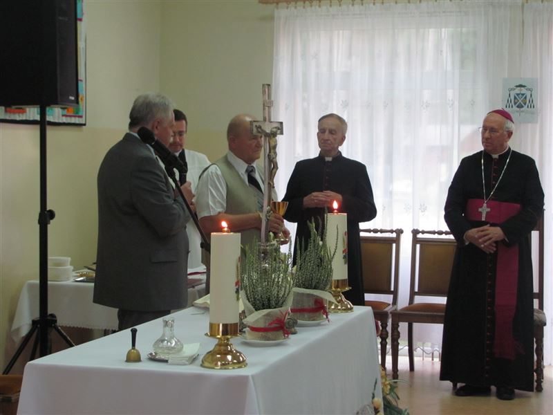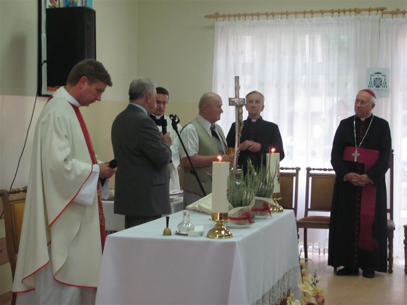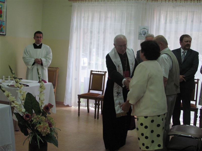 Nabożeństwo poprowadził ks Proboszcz Dariusz Kuźmiński, który pełni posługę kapłańską w naszym Domu. W trakcie uroczystej mszy ks Biskup poświęcił nową patenę oraz kielich, które będą służyły odtąd do sprawowania Mszy świętych.