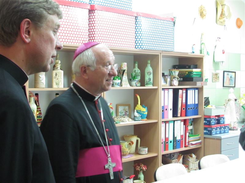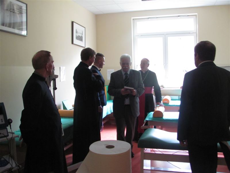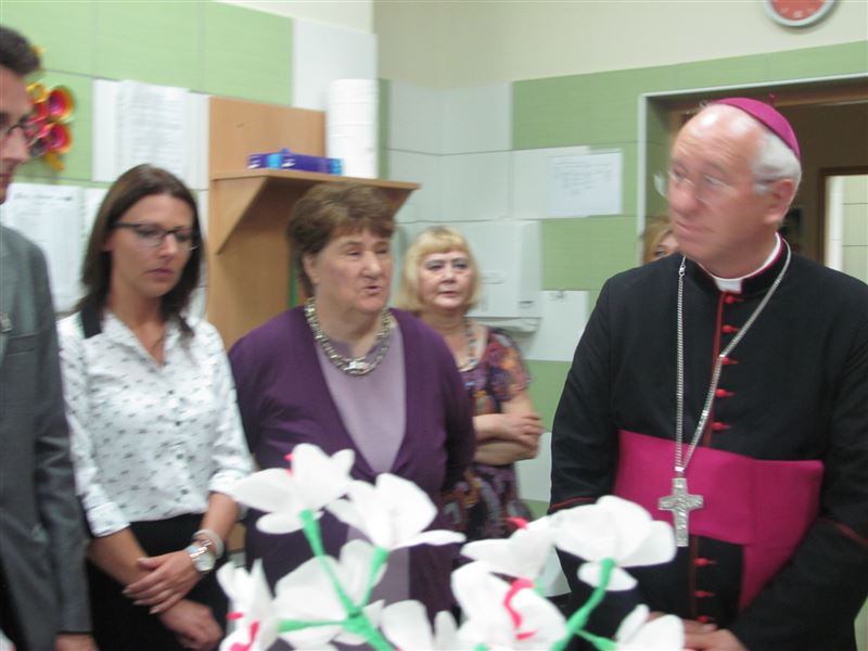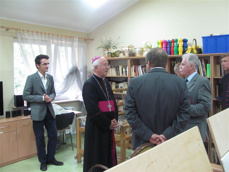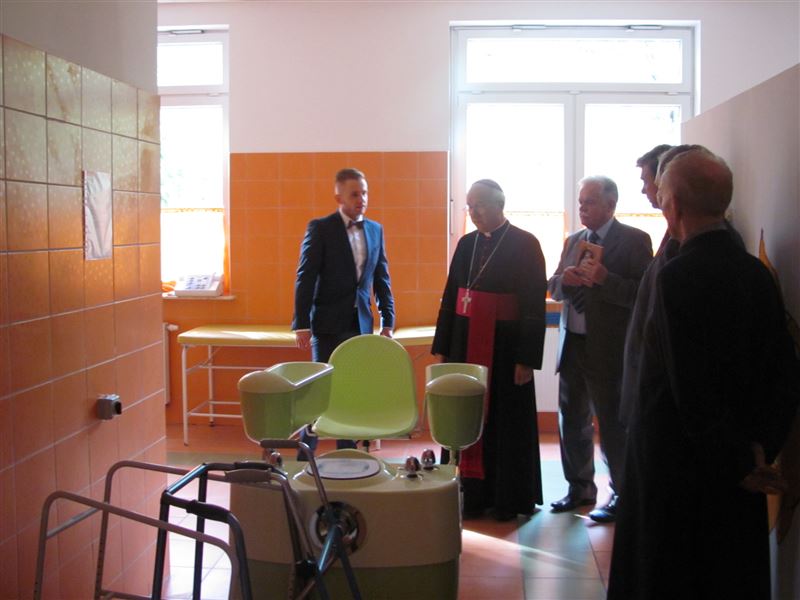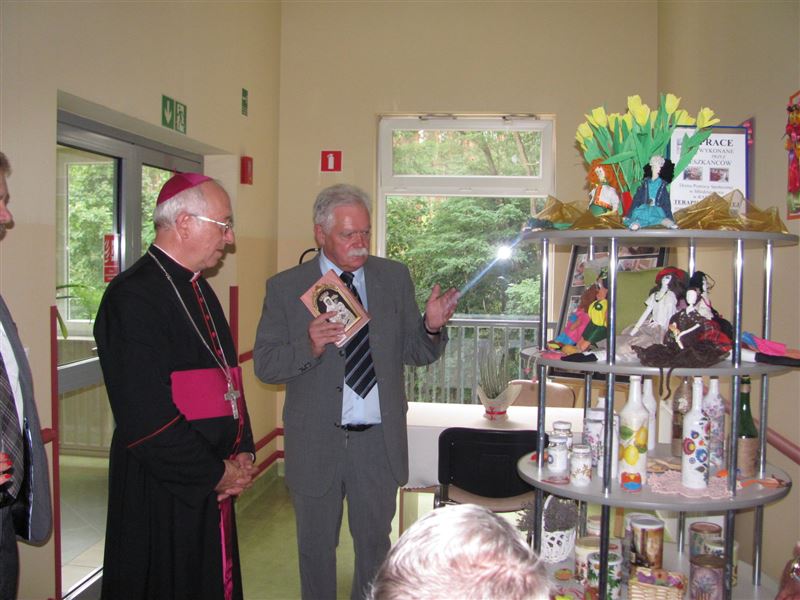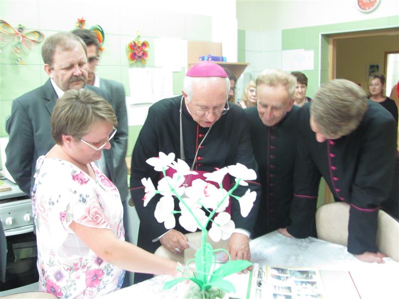Po mszy świętej ks Biskup w towarzystwie Pana Dyrektora obejrzał nasz Dom, sale terapii zajęciowej i rehabilitacji. Z wielkim zainteresowaniem oglądał efekty pracy naszych |Mieszkańców, małe „arcydzieła” tworzone podczas zajęć terapii. Ks Biskup odwiedził kilku mieszkańców w pokojach, zapoznał z mieszkańcami, znalazł chwilę na rozmowę - pełny ciepła rozmawiał z nimi i błogosławił. Ksiądz Biskup zatrzymał się też na chwilę na naszym uroczym patio, podziwiał usytuowanie Domu