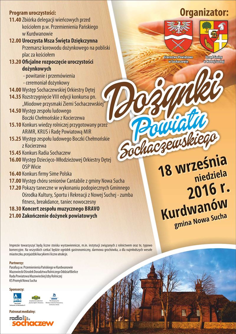 Już dziś zapraszamy na Święto Plonów Powiatu Sochaczewskiego i Gminy Nowa Sucha. Na dożynki powiatu sochaczewskiego zapraszają Jolanta Gonta, starosta sochaczewski oraz Maciej Mońka, wójt gminy Nowa Sucha.
