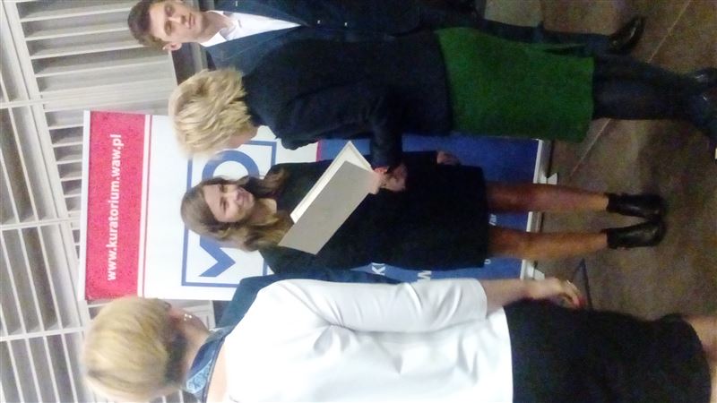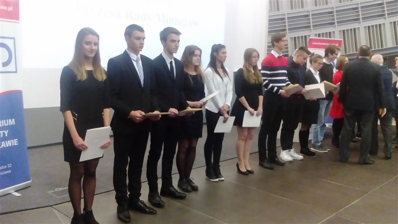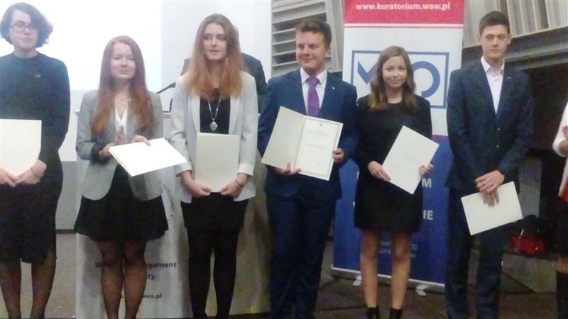 15 listopada w siedzibie Wyższej Szkoły Menedżerskiej w Warszawie odbyło się uroczyste wręczenie stypendiów Prezesa Rady Ministrów uczniom, którzy w ubiegłym roku szkolnym otrzymali promocję z wyróżnieniem, uzyskali najwyższą średnią w swojej szkole z wszystkich przedmiotów, a także wykazali się szczególnymi uzdolnieniami w zakresie wybranych przedmiotów. Z Warszawy i powiatów okołowarszawskich kryteria te spełniło 239 uczniów. W gronie tym znaleźli się również nasi uczniowie - Marta Rybicka z kl. IVB Technikum Budowlanego oraz Aleksandra Gala z kl. IIB Liceum Ogólnokształcącego. Akty przyznania stypendiów w imieniu Prezesa Rady Ministrów wręczali: Aurelia Michałowska - Mazowiecki Kurator Oświaty, Dorota Skrzypek - Mazowiecki Wicekurator Oświaty, Mirosław Krusiewicz - dyrektor Departamentu Edukacji Publicznej i Sportu w Urzędzie Marszałkowskim oraz prof. Stanisław Dawidziuk - Prezydent Wyższej Szkoły Menedżerskiej w Warszawie. Uroczystość uświetnił występ uzdolnionej młodzieży z jednego z warszawskich liceów.
