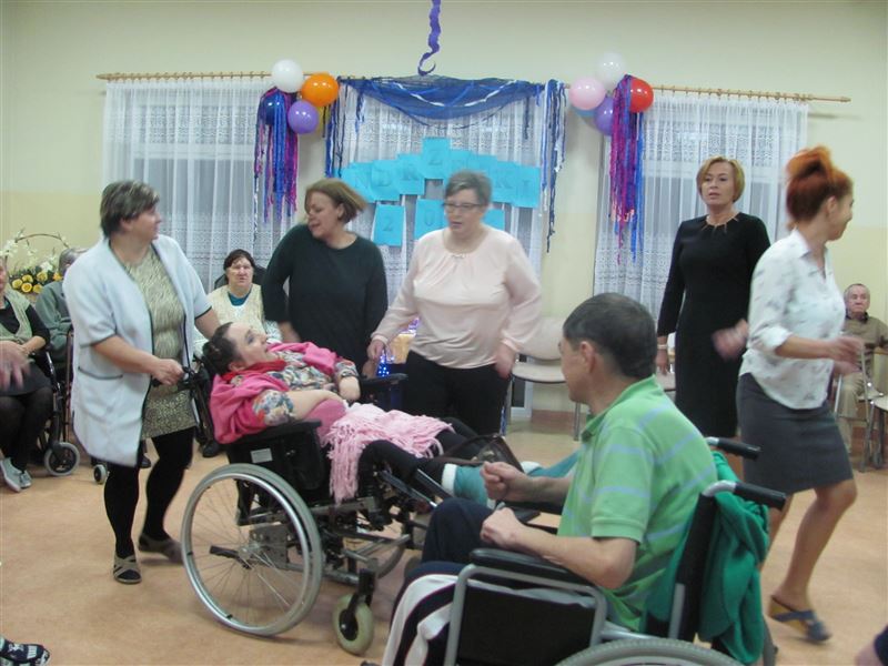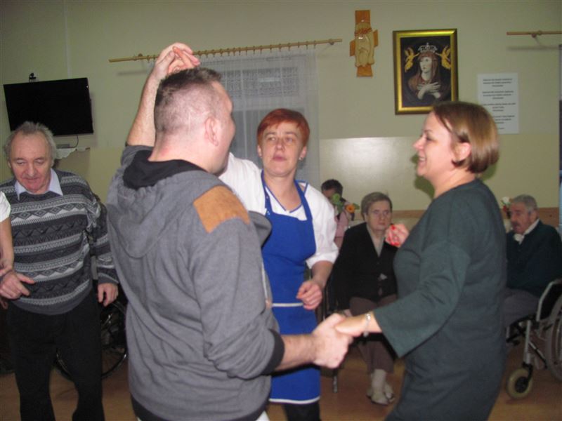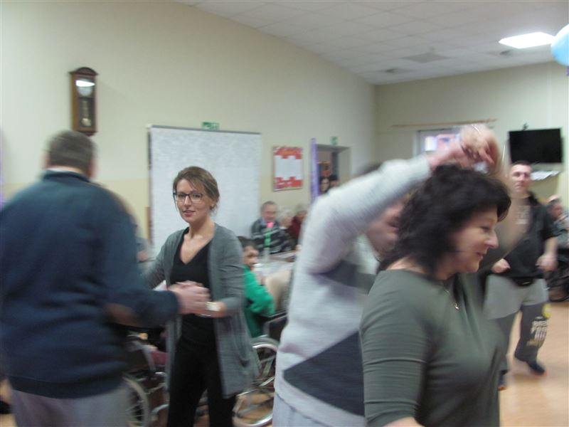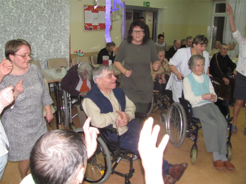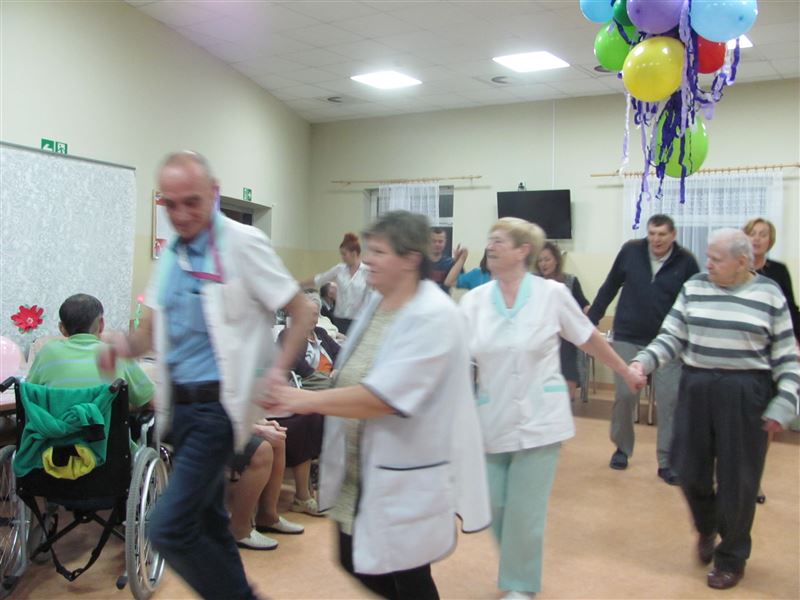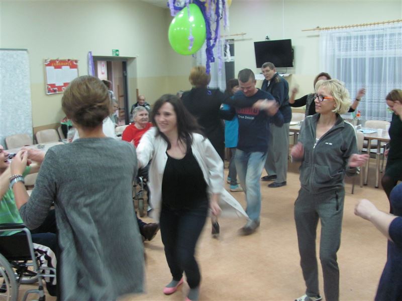 Panie pracujące na Terapii zajęciowej zadbały również o organizację konkursu tańca na gazetach.