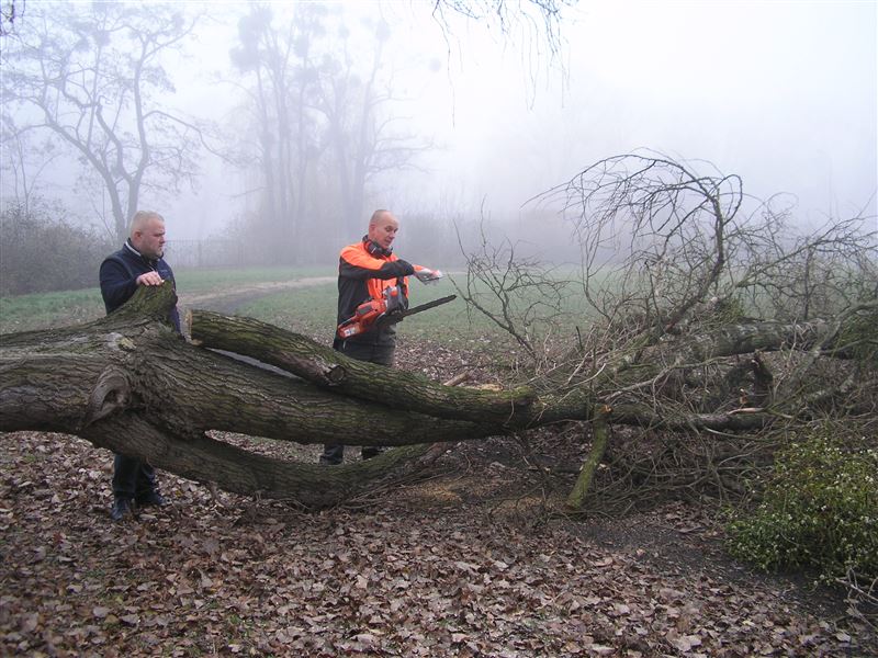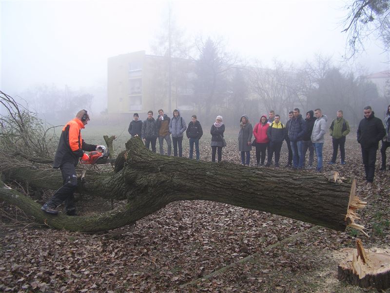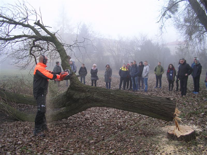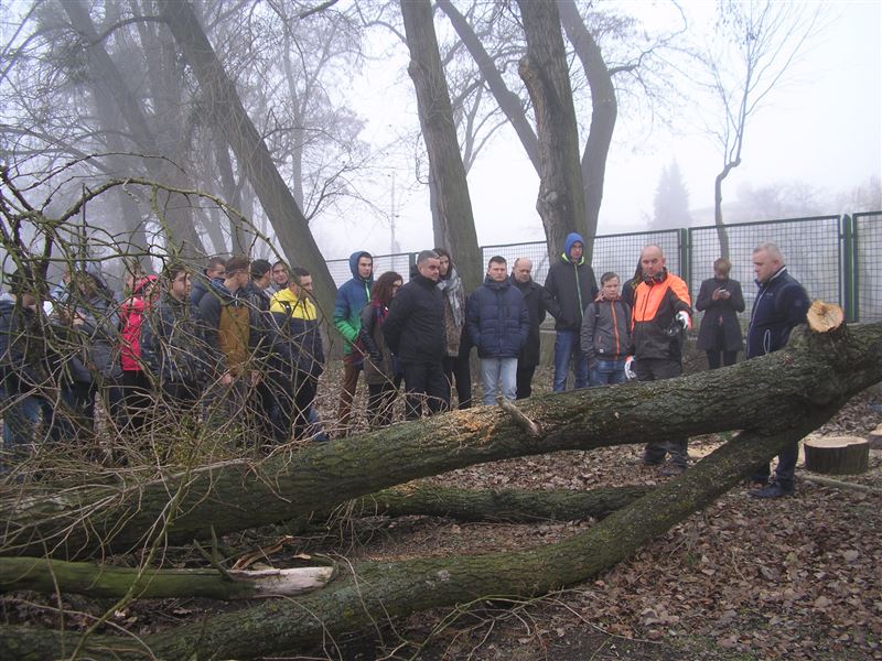W drugiej części spotkania odbył się pokaz pracy pilarki spalinowej w terenie. Obejmował on ścinkę drzewa z odcięciem gałęzi. Główny akcent pokazu skierowany był na technikę ścinki, manewrowanie piłą spalinową przy obcinaniu gałęzi oraz zasady bezpieczeństwa obowiązujące przy wykonywaniu tych prac.