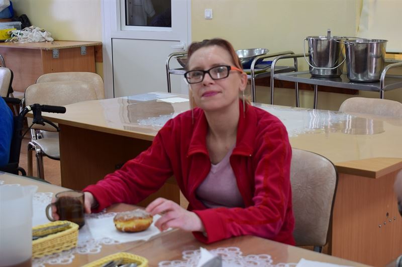 Z tej okazji wykonana była także dekoracja stołówki, zawieszony był pączek gigant zrobiony przez Mieszkańców w ramach terapii zajęciowej. Wyglądał również przepysznie, chociaż zrobiony był z tak prostych materiałów jak pudełka tekturowego i bibuły, a do tego jeszcze trochę wyobraźni naszych zdolnych Mieszkańców.