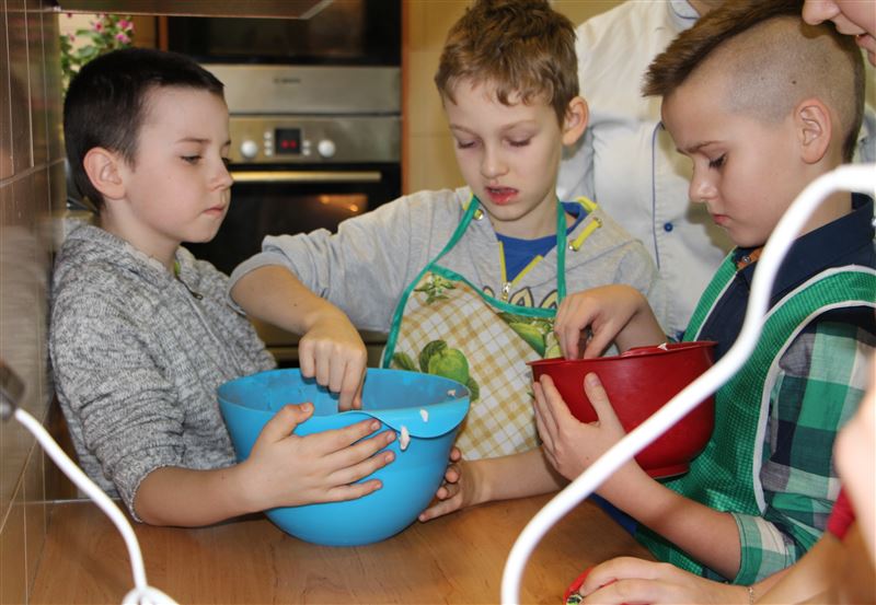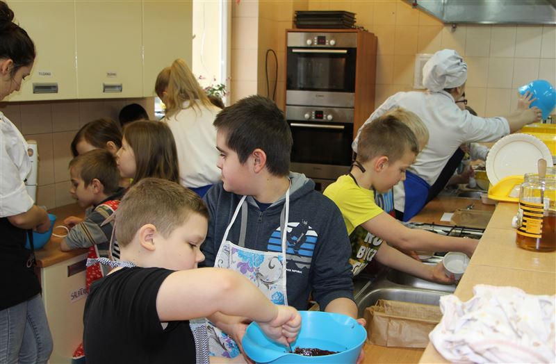 Uczniowie klasy III a z Techniku Żywienia i Usług Gastronomicznych kolejny raz już pod okiem nauczycielek – Aldony Kośmider i Anety Bożewskiej przygotowali zajęcia kulinarne dla trzech klas ze Szkoły Podstawowej nr 3. Spotkanie trwało 4 godziny, a w tym czasie dzieci wysłuchały wykładu pt. „Ja zrobić zdrowe łakocie”, mogły nauczyć się różnych form składania serwetek, zobaczyły jak nakrywać stół na różne okolicznościowe uroczystości. Dużym zainteresowaniem cieszyły się zajęcia w kuchni, gdzie najmłodsi pod okiem uczniów „Ogrodnika” wykonały m.in. ciasto brownie z czerwoną fasolą, ciasteczka owsiane, kuleczki z daktyli, pastę imitującą czekoladę z suszonych moreli, śliwek i kakao. Hitem zaś były batoniki z płatków owsianych i żurawiny. Oczywiście, wszystkich smakołyków można było skosztować. Co istotne, zaproponowane do przygotowania słodkości powstały bez użycia mąki i jaj – były bowiem bezglutenowe.