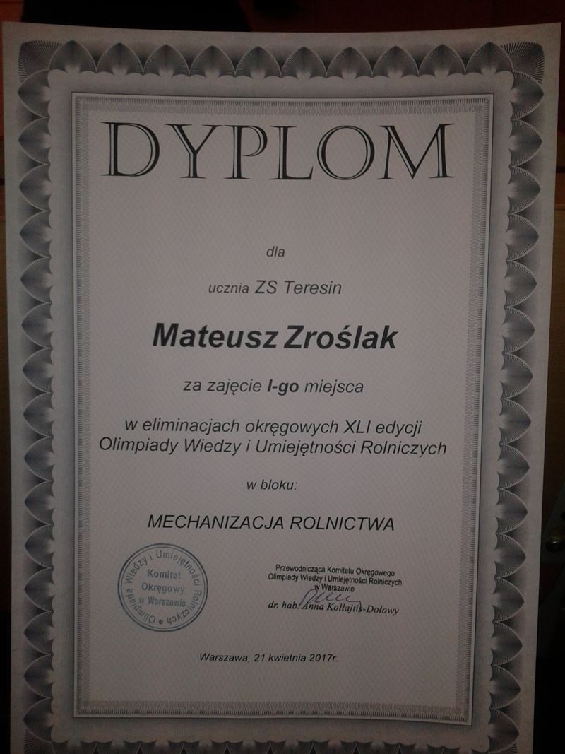 Bardzo cenny sukces naukowy odniósł uczeń Zespołu Szkół im. Stefana Kardynała Wyszyńskiego w Teresinie – Mateusz Zroślak. Wygrał okręgowe eliminacje 41. Olimpiady Wiedzy i Umiejętności Rolniczych.