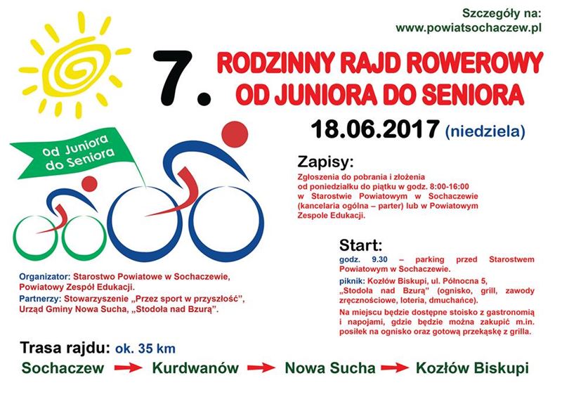 Na rozpoczęcie udanych wakacji Starostwo Powiatowe w Sochaczewie oraz Powiatowy Zespół Edukacji zaprasza wszystkich do udziału w 7 rajdzie rowerowym po powiecie sochaczewskim „Od Juniora do Seniora”.