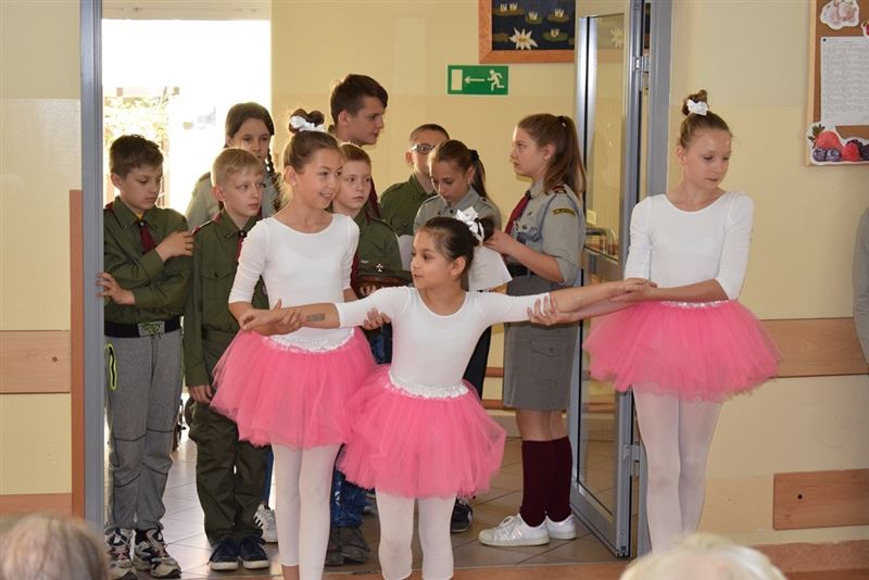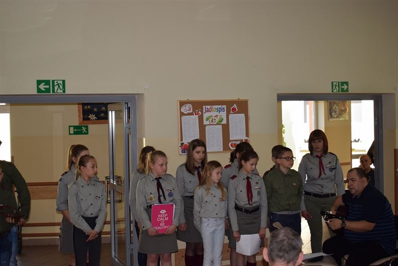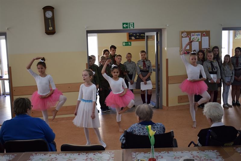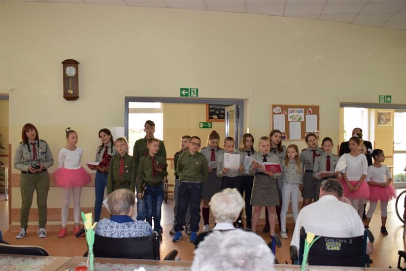 W repertuarze przez nich przygotowanym mogliśmy usłyszeć piosenki harcerskie oraz najpopularniejsze utwory biesiadne. Utwory te poderwały do tańca domowników, którzy bardzo cieszyli się z zasłyszanych, znanych melodii. Spotkanie to przerodziło się w niesamowitą zabawę. Po występach harcerzy, mogliśmy obejrzeć pokaz tańca akrobatycznego, wykonanego przez uczennice ze Szkoły Podstawowej w Żukowie. Występ ten pozwolił mieszkańcom Domu Pomocy Społecznej wrócić do czasów młodości i wspomnieć chwile pełnej sprawności i aktywności.