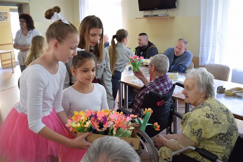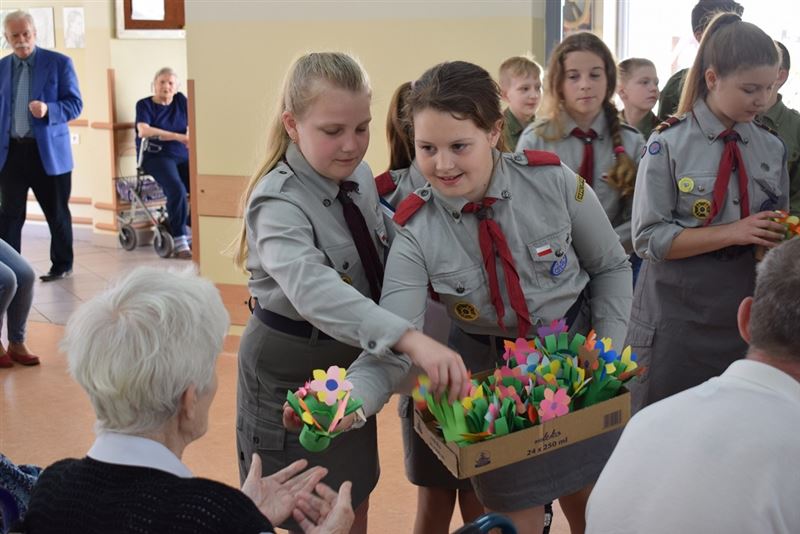 Spotkanie zakończyło się wręczeniem przez harcerzy pensjonariuszom własnoręcznie wykonanych kwiatów. Był to piękny wiosenny akcent, który ubogacił serca naszych mieszkańców, napełniając radością ich dusze.