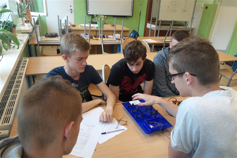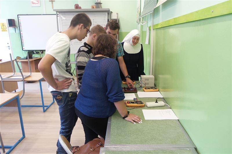 Największym powodzeniem cieszyły się doświadczenia związane z badaniem poboru energii przez tradycyjne żarówki i energooszczędne oraz doświadczenie z pomiarami oporu dla szeregowego i równoległego połączenia oporników. Uczniowie chętnie zadawali pytania, dyskutowali, analizowali i wyciągali trafne naukowe wnioski. Nauczyciel prowadzący był mile zaskoczony zainteresowaniem i dyscypliną na tych warsztatach, na których uczniowie naszego technikum byli doskonałymi asystentami. Druga grupa gimnazjalistów korzystała z naszego symulatora nauki jazdy, który cieszył się ogromnym zainteresowaniem.
