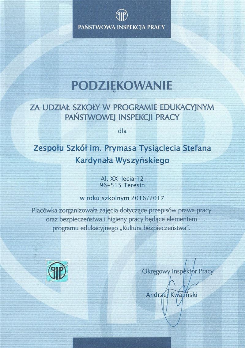 Państwowa Inspekcja Pracy wystosowała specjalne podziękowanie dla społeczności Zespołu Szkół w Teresinie za aktywny udział w Programie Edukacyjnym PIP. Teresińska placówka organizowała zajęcia dotyczące przepisów prawa pracy oraz bezpieczeństwa i higieny pracy będące elementem programu „Kultura Bezpieczeństwa”. Podziękowania dla szkoły złożył Andrzej Kwaliński, Okręgowy Inspektor Pracy.
