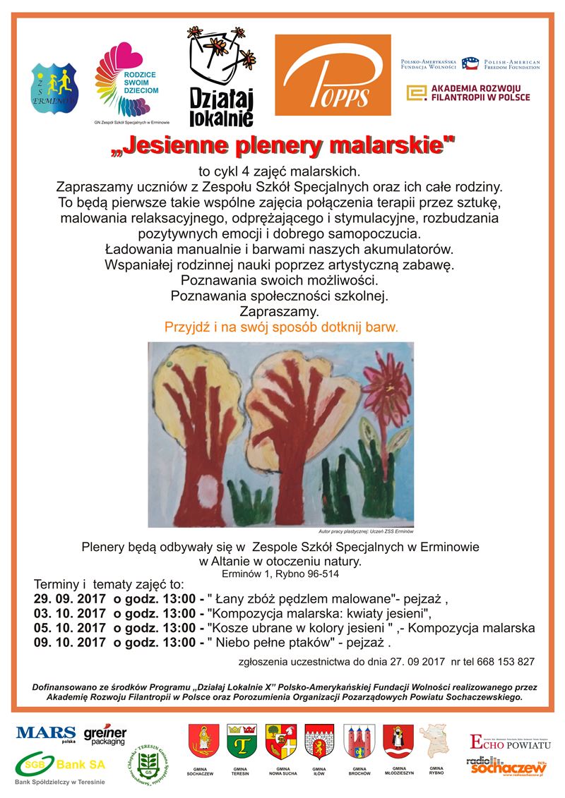 „Jesienne plenery malarskie” to cykl czterech zajęć malarskich o różnej tematyce, dla uczniów i ich rodzin, zakończone wystawą. To integracja, rehabilitacja, zabawa i edukacja poprzez sztukę.