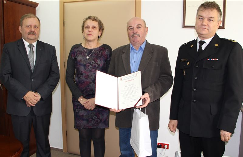 Przypomnijmy, do zdarzenia doszło 1 października br. przy ul. Nowowiejskiej w Sochaczewie. O godz. 18.53 wpłynęło do Komendy Powiatowej PSP wpłynęło zgłoszenie o pożarze w budynku jednorodzinnym. Po dojeździe do miejsca zdarzenia zastępów z JRG Sochaczew, dowódca akcji potwierdził informację o pożarze dodając, że osoba poszkodowana została ewakuowana z budynku objętego pożarem przez osobę postronną przed przybyciem jednostek ochrony ppoż. Poszkodowany mężczyzna był przytomny, miał poparzone ręce i twarz. Po zakończeniu działań ratowniczo-gaśniczych ustalono, że osobą, która udzieliła pomocy poszkodowanemu z narażeniem własnego życia i zdrowia był Waldemar Miałkos, mieszkaniec sąsiedniej ulicy. – Bohaterska postawa Pana Waldemara przyczyniła się do uratowania życia poszkodowanemu mężczyźnie. Jestem pełen podziwu dla niego, wykazał się niezwykłą odwagą – przyznał bryg. Wiesław Gorzki, zastępca Komendanta Powiatowego Państwowej Straży Pożarnej w Sochaczewie. Uznania dla tego bohaterskiego czyny nie kryją też władze powiatu. - To wielka radość, że wśród mieszkańców Ziemi Sochaczewskiej są osoby tak wrażliwe i wyczulone na ludzką krzywdę oraz bezinteresowną pomoc innym. Jest Pan niewątpliwie przykładem i wzorem do naśladowania dla nas wszystkich. Ten godny naśladowania czyn zasługuje na najwyższe uznanie, szacunek i wdzięczność – mówiła starosta Jolanta Gonta, dziękując i gratulując w imieniu władz Samorządu Powiatowego i Komendy Powiatowej Państwowej Straży Pożarnej w Sochaczewie Waldemarowi Miałkosowi. Wręczyła też zaproszonemu upominek. On sam nie czuje się bohaterem, uważa, że nie zrobił nic nadzwyczajnego. Tymczasem zagrożenie było ogromne, bowiem blisko ognia znajdowała się butla z gazem. Jednak jak przyznaje, potrzeba uratowania sąsiada była sprawą nadrzędną.