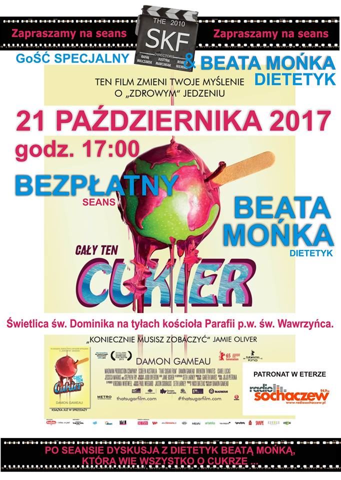 Zespół Szkół w Erminowie serdecznie zaprasza rodziców i dzieci do wzięcia udziału w spotkaniu z panią dietetyk Beatą Mońką, które odbędzie się w sobotę 21 października 2017r (sobota) o godzinie 17.00 na tyłach kościoła Św. Wawrzyńca w Sochaczewie. Przed spotkaniem zapraszamy do obejrzenia filmu pod tytułem „Cały ten cukier”. Spotkanie i seans są bezpłatne. Gorąco zapraszamy do udziału!