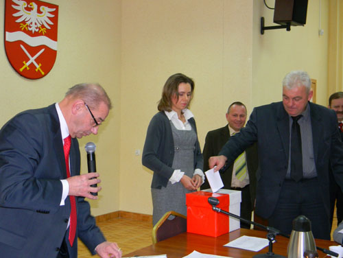 Po złożeniu ślubowania przez wszystkich radnych Rady Powiatu przystąpiono do głosowania nad wyborem Przewodniczącego Rady Powiatu. Nad sprawnym przebiegiem wszystkich głosowań czuwała komisja skrutacyjna w składzie: Tadeusz Głuchowski – przewodniczący oraz członkowie – Beata Fastyn i Zbigniew Pakuła.