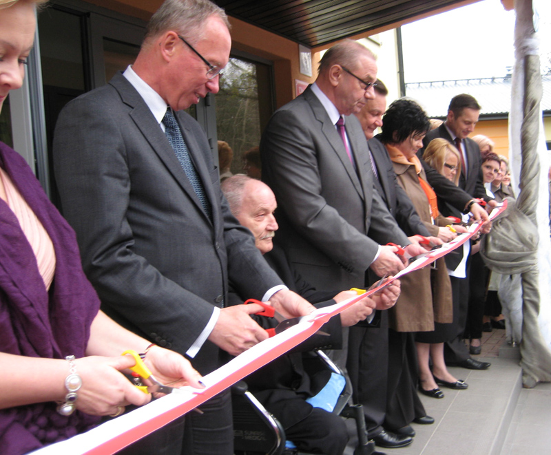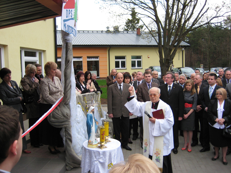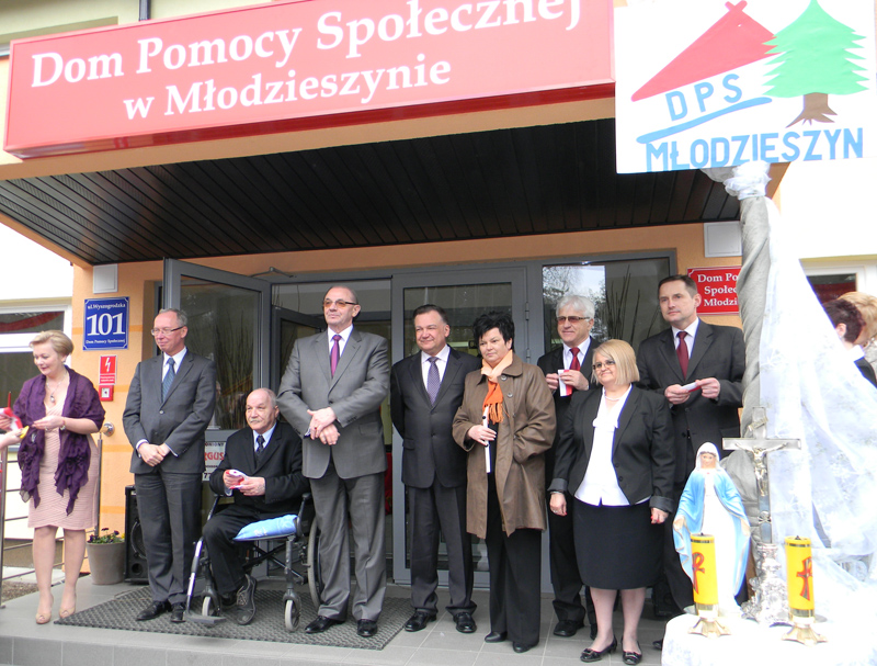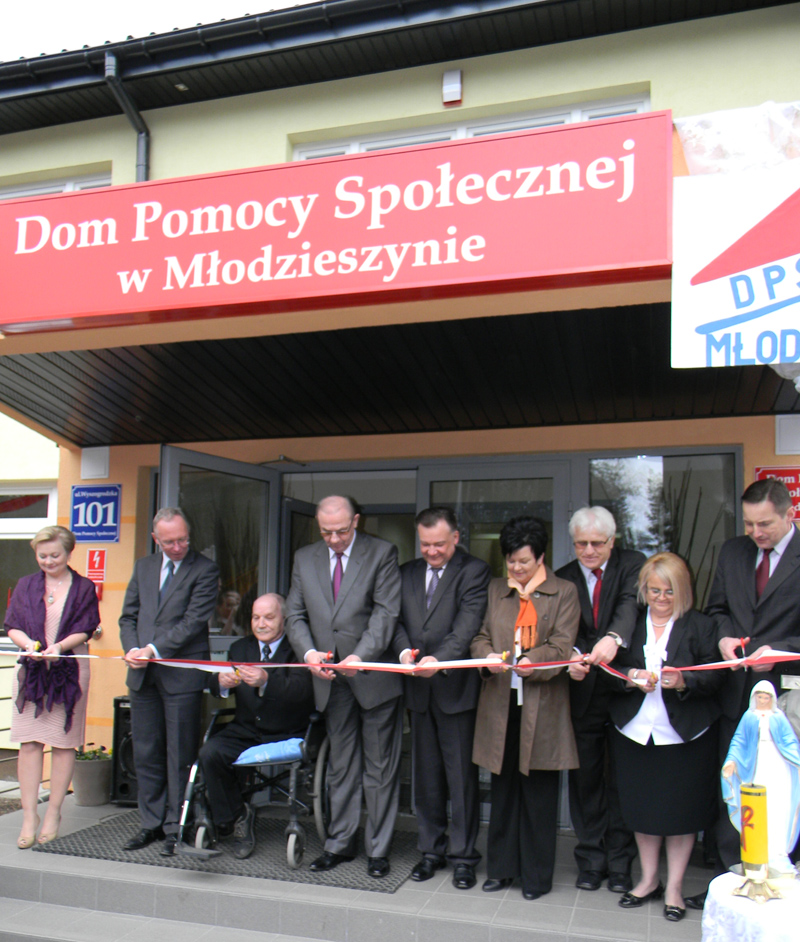 Po poświęceniu murów Domu Pomocy Społecznej, którego dokonał proboszcz parafii Narodzenia Najświętszej Maryi Panny w Młodzieszynie ks. Józef Rudzki nastąpił kulminacyjny moment tej podniosłej uroczystości – przecięcie wstęgi. Aktu tego dokonali: Adam Struzik – Marszałek Województwa Mazowieckiego, Jacek Kozłowski – Wojewoda Mazowiecki, Halina Pędziejewska – Przewodnicząca Rady Powiatu w Sochaczewie, Tadeusz Koryś – Starosta Sochaczewski, Janusz Ciura - Wicestarosta Sochaczewski, Justyna Nowak-Sobotta – Dyrektor Domu Pomocy Społecznej w Młodzieszynie, Joanna Szymańska – Wójt Gminy Młodzieszyn, Piotr Osiecki – Burmistrz Miasta Sochaczew (Wicestarosta Sochaczewski w latach 2006- 2010) oraz Wiesław Leszczyński – mieszkaniec Domu Pomocy Społecznej w Młodzieszynie.